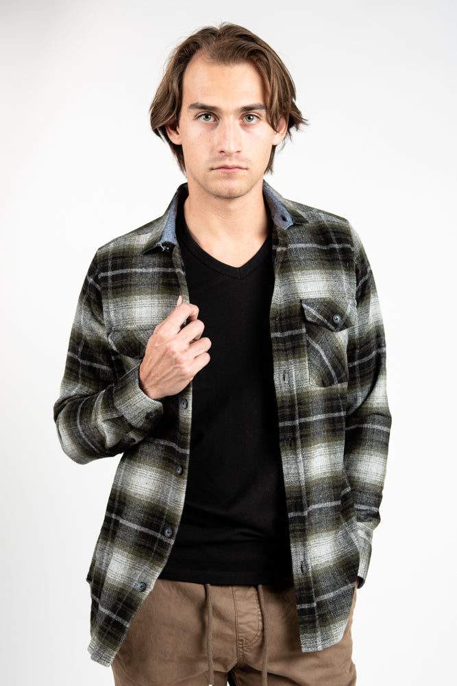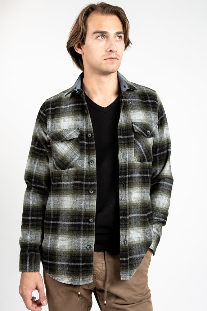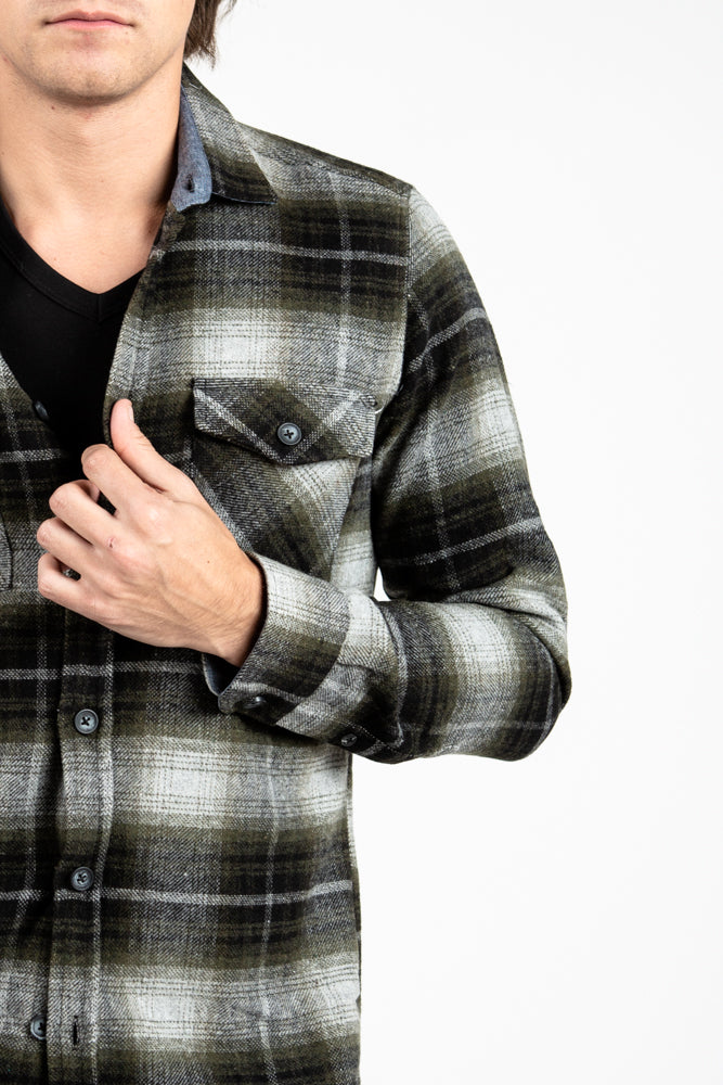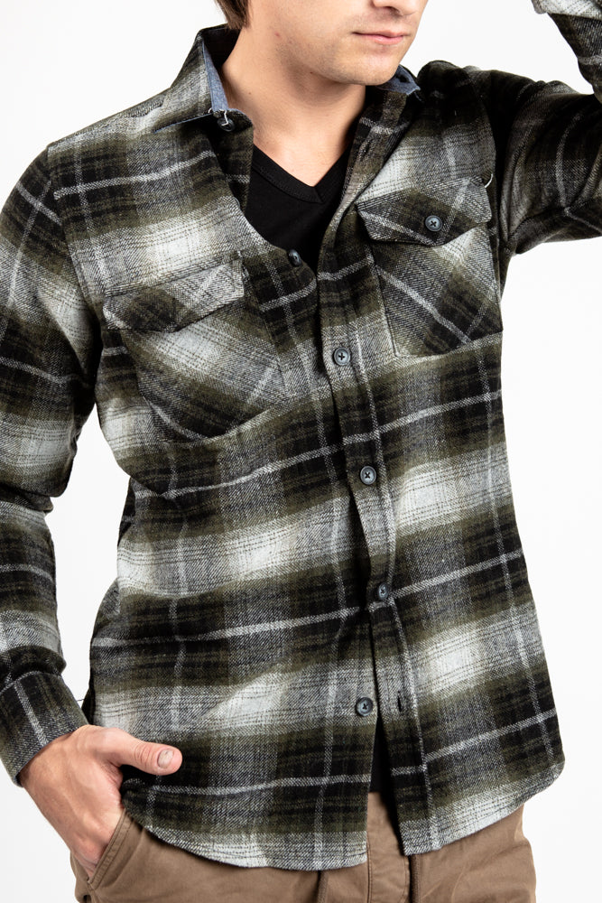 Men's flannel overshirt. Two flap pockets 100% cotton in dark plaid green.
