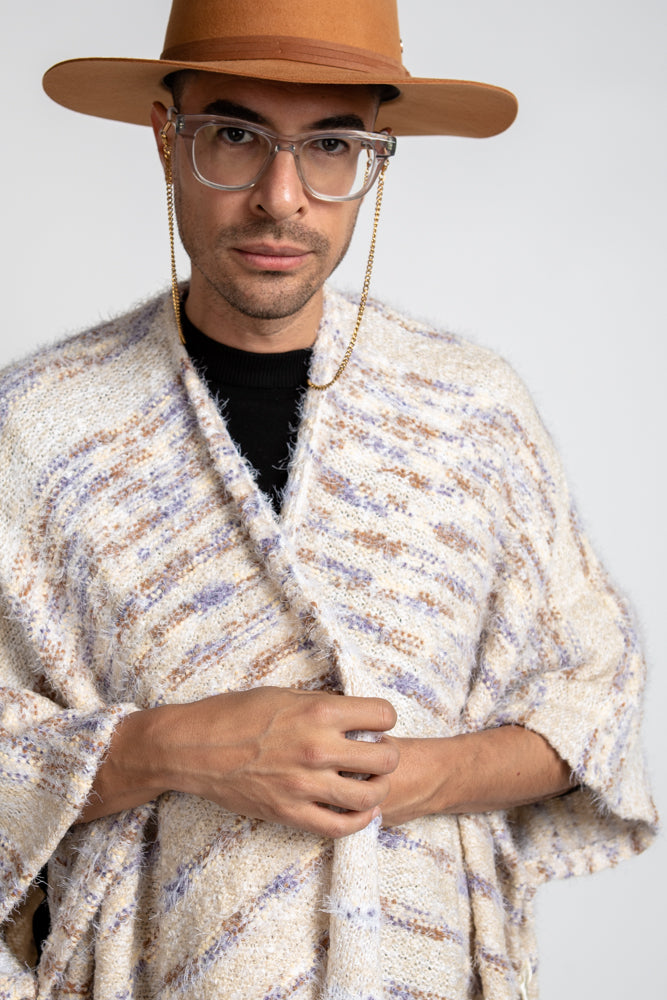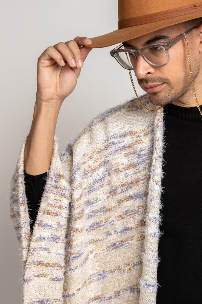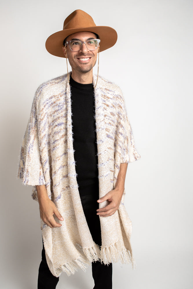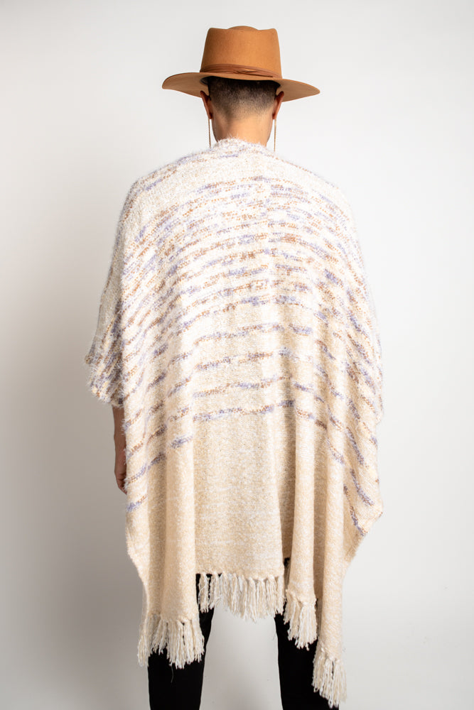 Fuzzy striped poncho with an open front and batwing sleeves. Features a fringe hem with side slits. The perfect knit poncho for the Fall season.