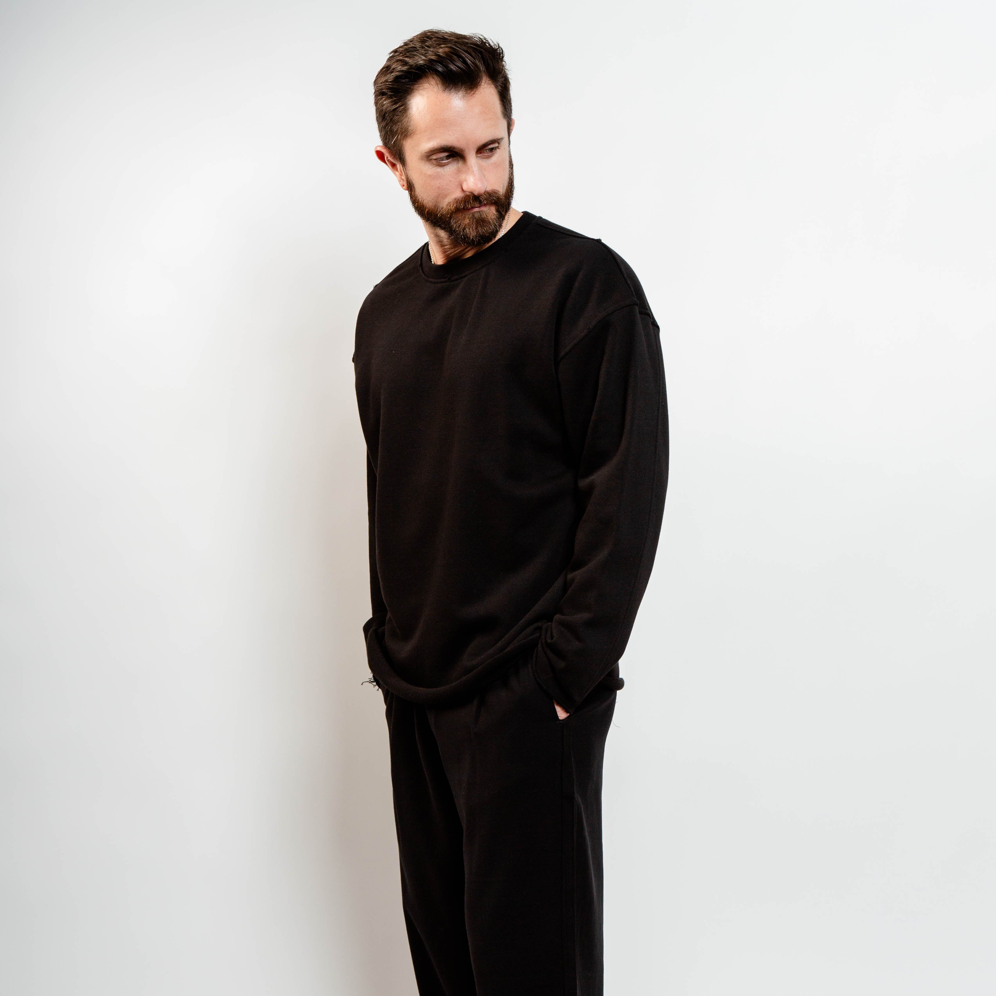 The Raw Edge Sweatshirt in black brings quiet edge to a timeless silhouette. Crafted from soft mid-weight cotton jersey, it features raw hems and an unrefined neckline for a subtle deconstructed effect. The dropped shoulder fit and relaxed cut create a draped, minimalist shape that balances ease and structure. Designed for versatility, it pairs effortlessly with tailored trousers or denim for a sleek, modern uniform.