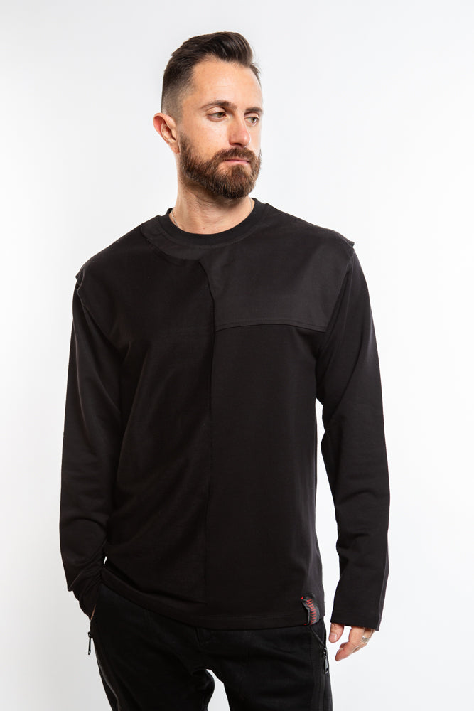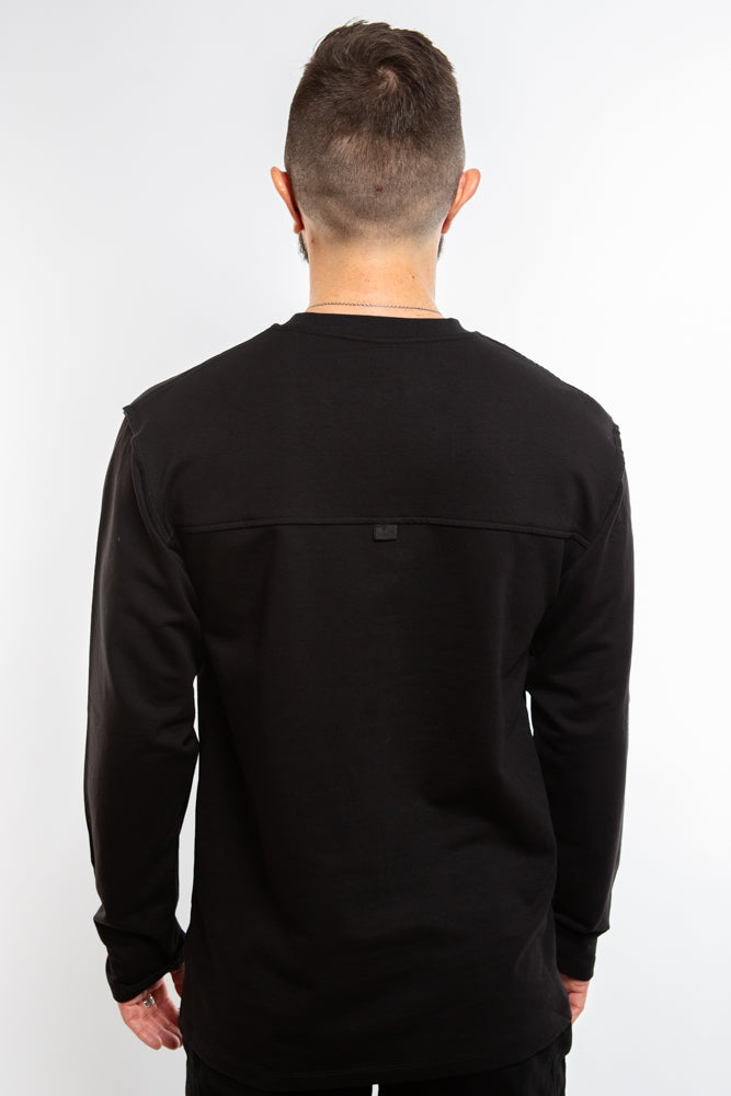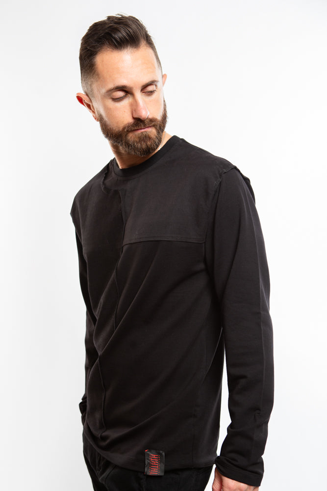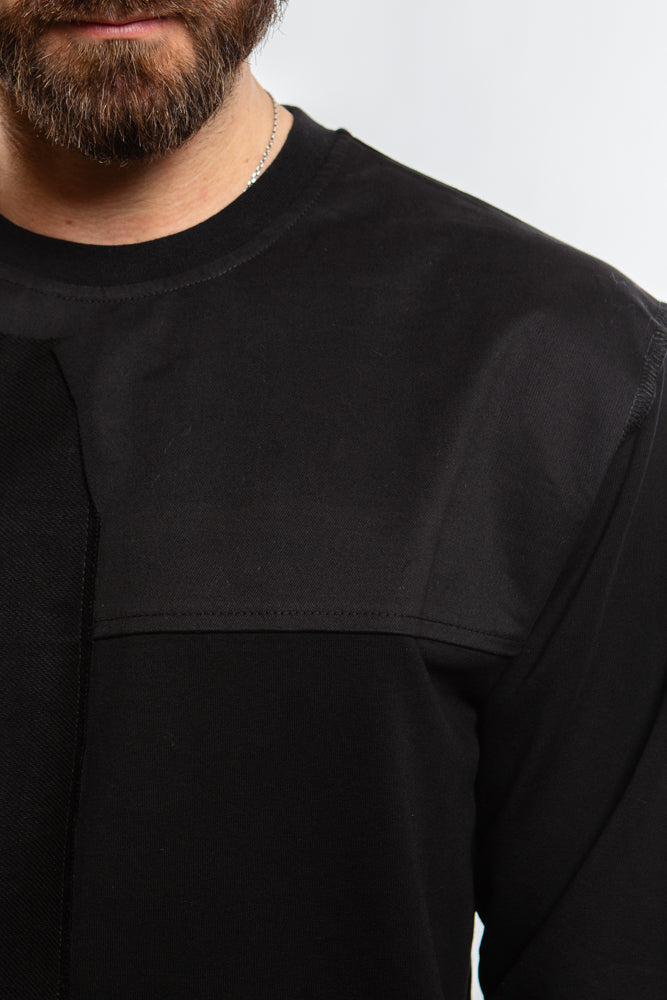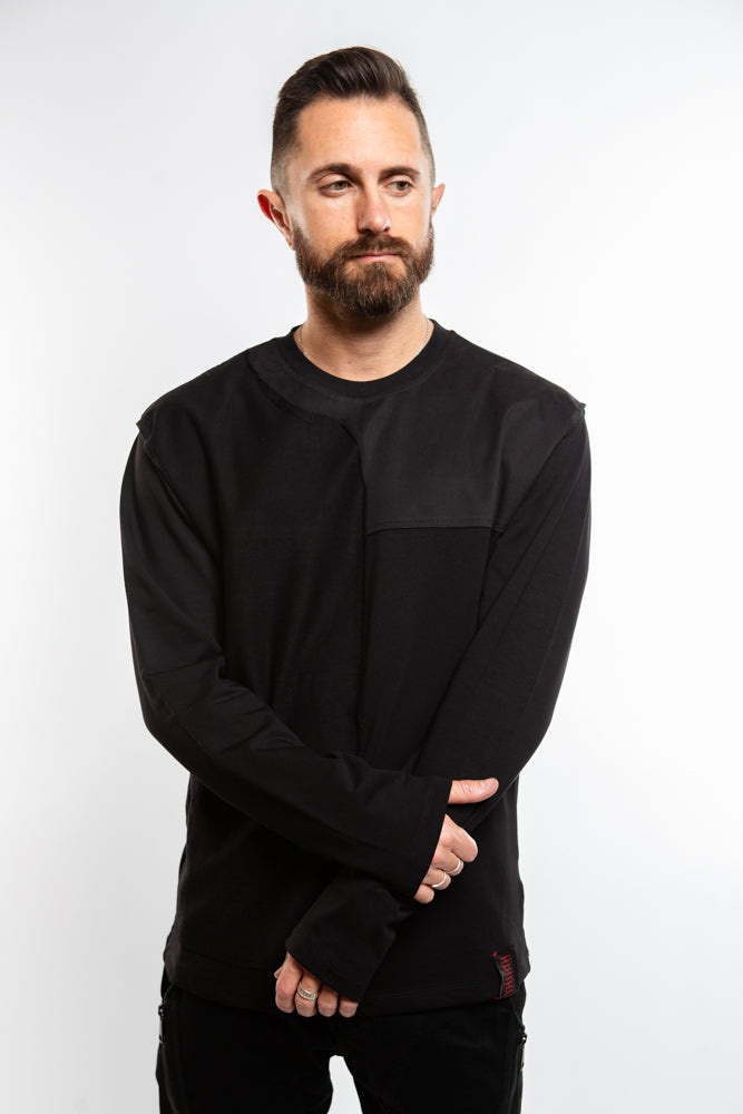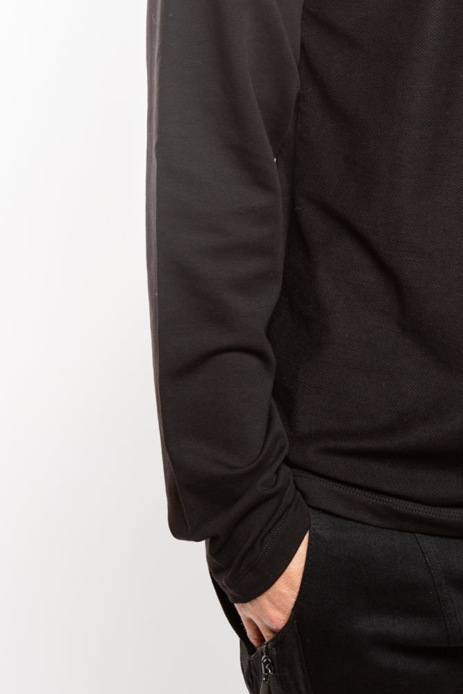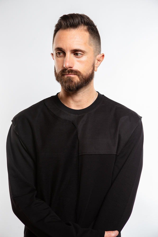 The Rhys Sweater in Black exudes an edgy allure with its structured and ribbed panels. The crew neck and ribbed collar add sophistication to this avant-garde piece. Stay warm and stylish in this premium sweater.