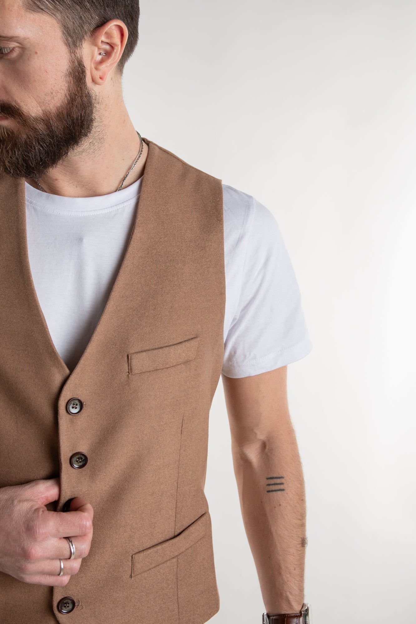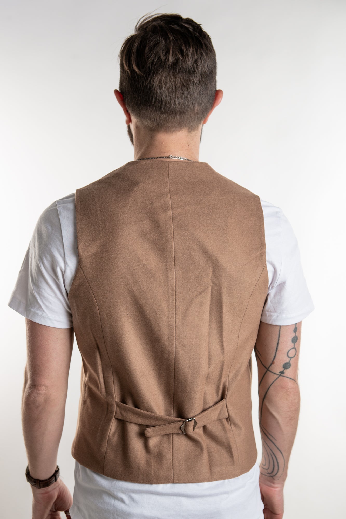 Light Brown color waistcoat with lapel collar for men. Slim fit 5 buttons single breasted closure. Can be worn over a t-shirt, long sleeve shirt or dress shirt.