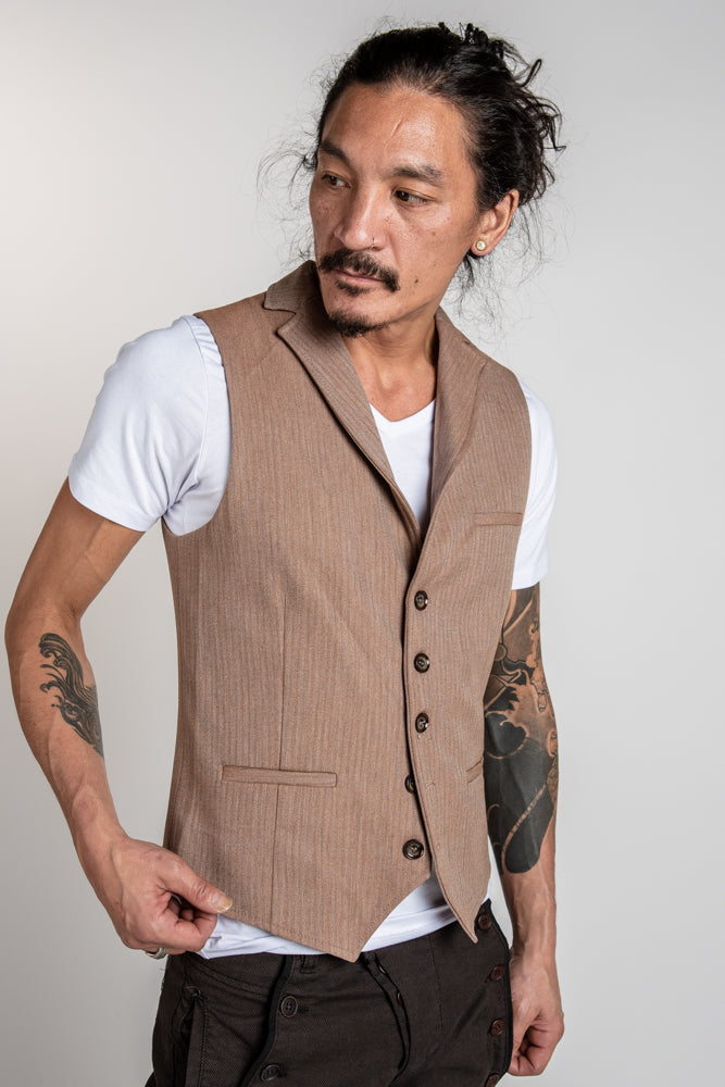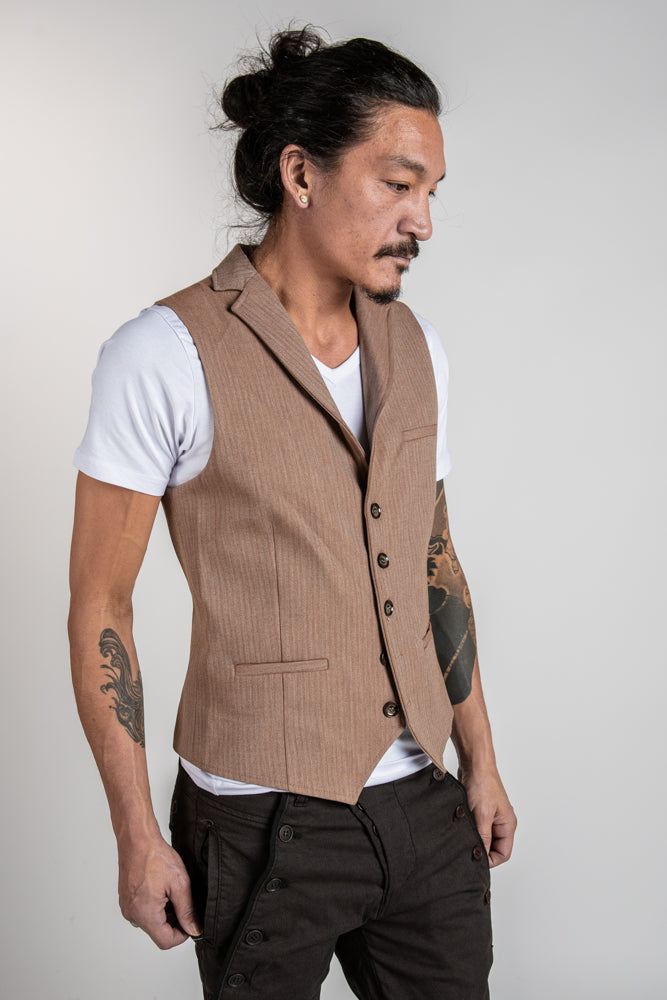 Coffee color waistcoat with lapel collar for men. Slim fit 5 buttons single breasted closure. Can be worn over a t-shirt, long sleeve shirt or dress shirt.