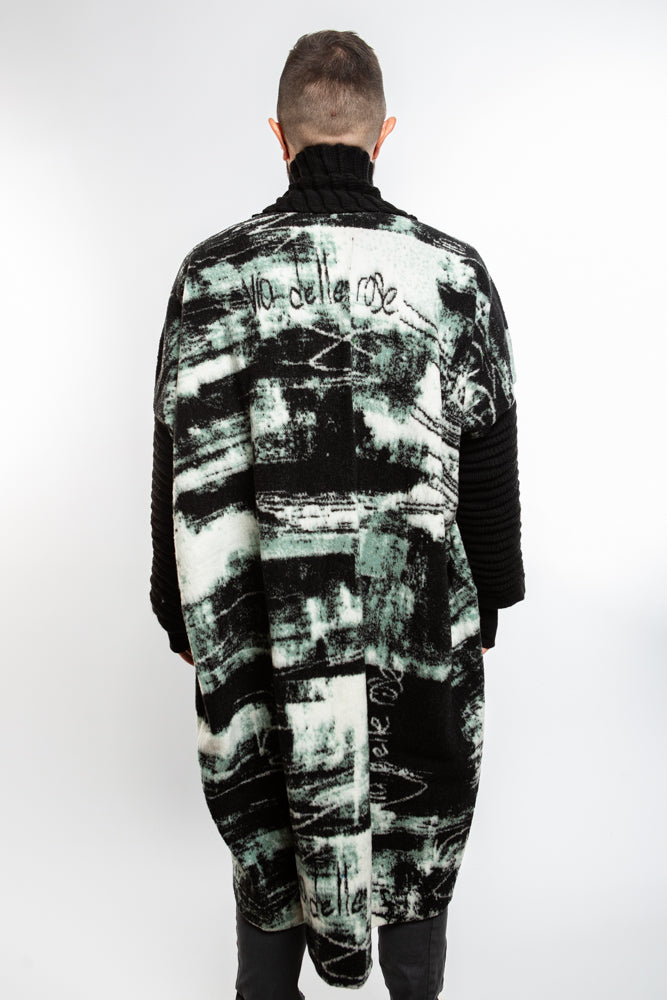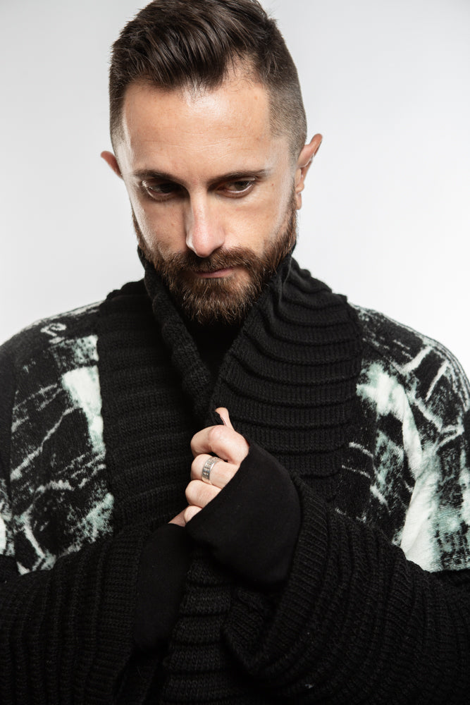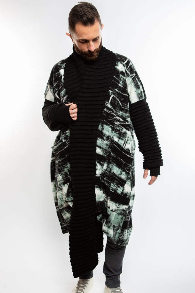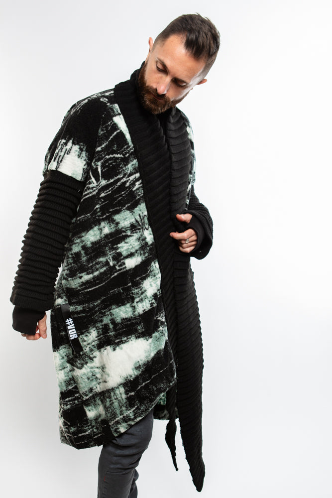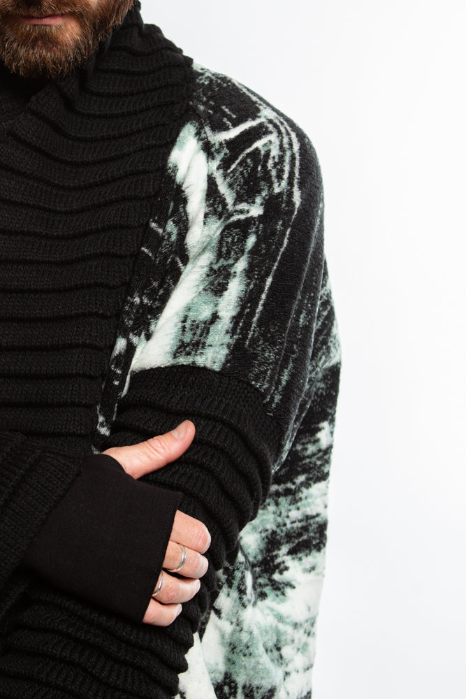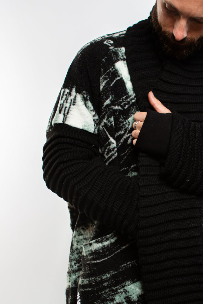 Introducing our Black Shizuku Shawl Cardigan, inspired by Japanese design and crafted with a futuristic avant-garde twist. The full length, oversized shawl and rolled ribbed sleeves add a touch of luxury to this knit piece. Elevate your style with this exclusive and elegant cardigan.
