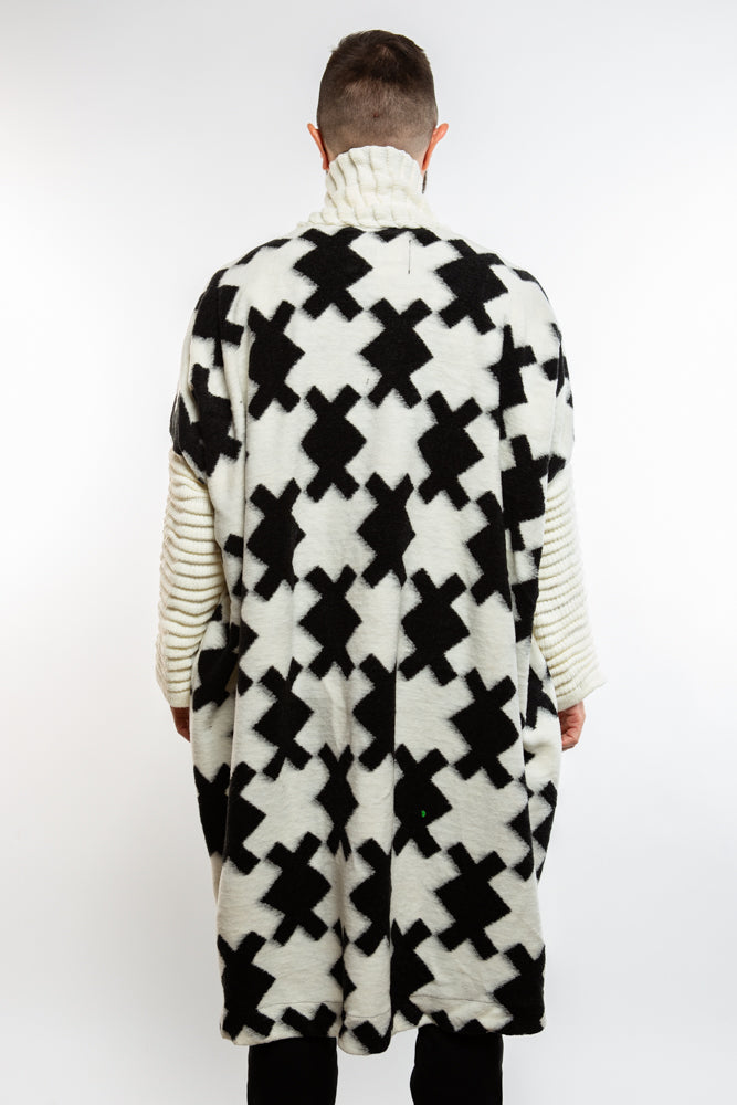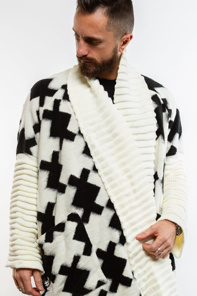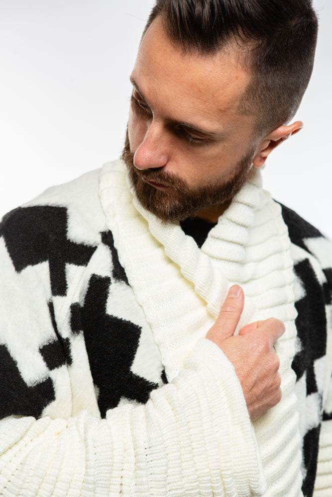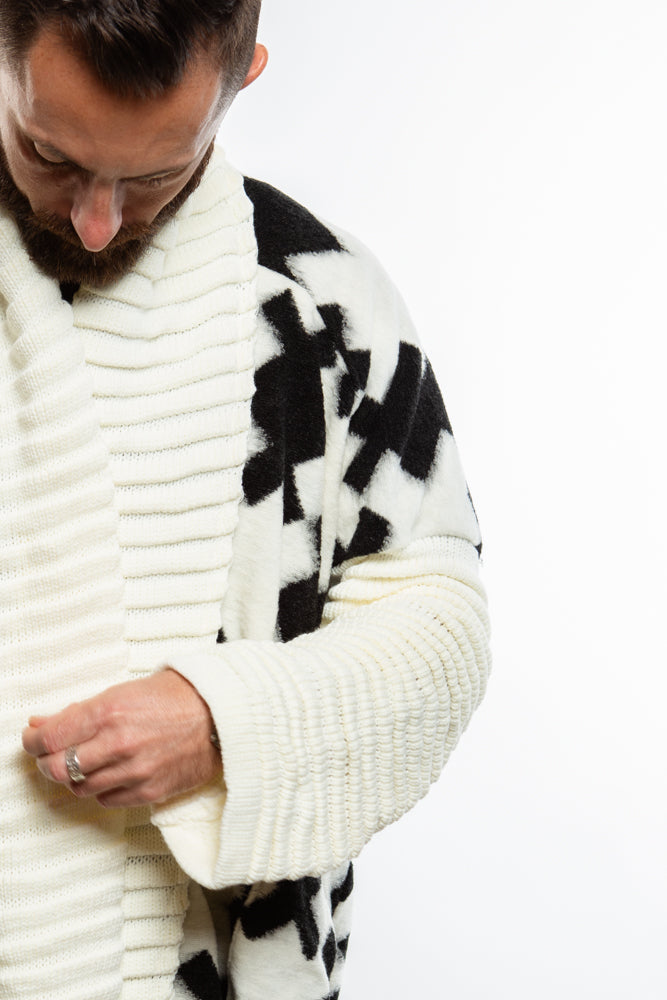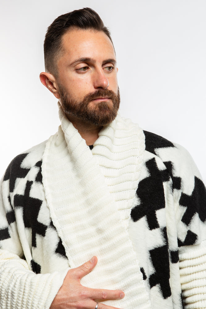 Introducing our White Quinn Shawl Cardigan, inspired by Japanese design and crafted with a futuristic avant-garde twist. The full length, oversized shawl and rolled ribbed sleeves add a touch of luxury to this knit piece. Elevate your style with this exclusive and elegant cardigan.