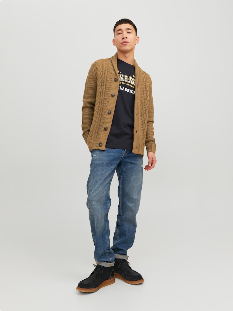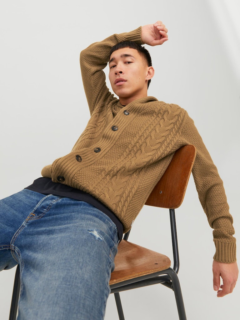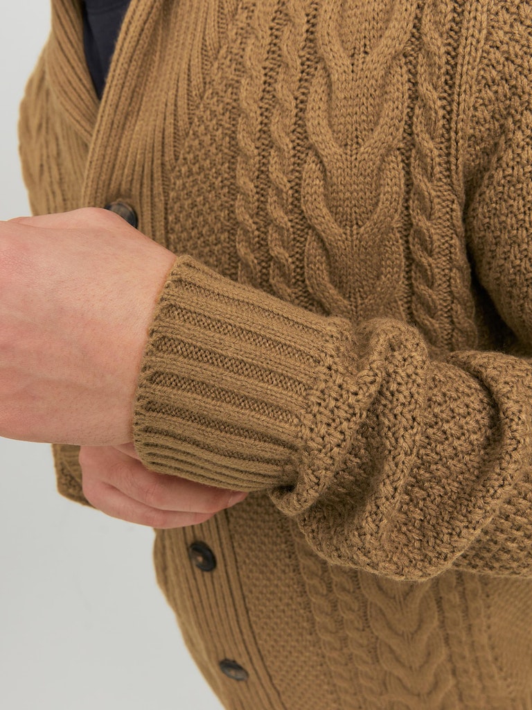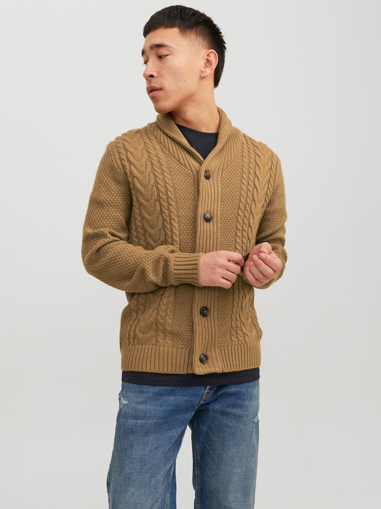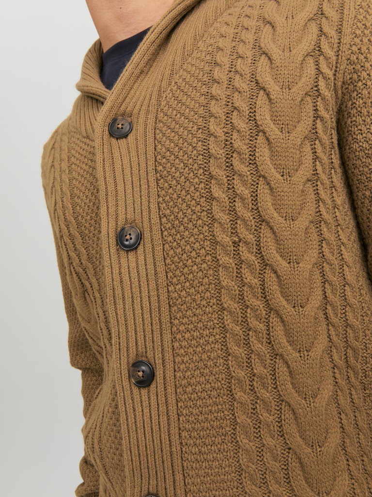 This SHAWL NECK CARDIGAN - OTTER combines coziness and style with its classic cable knit design. Its timeless appeal, warm and comfortable feel, and versatile cardigan knit will add an effortless sophistication to your wardrobe. With its button fastening, this piece is sure to be an essential for all of your lifestyle needs.