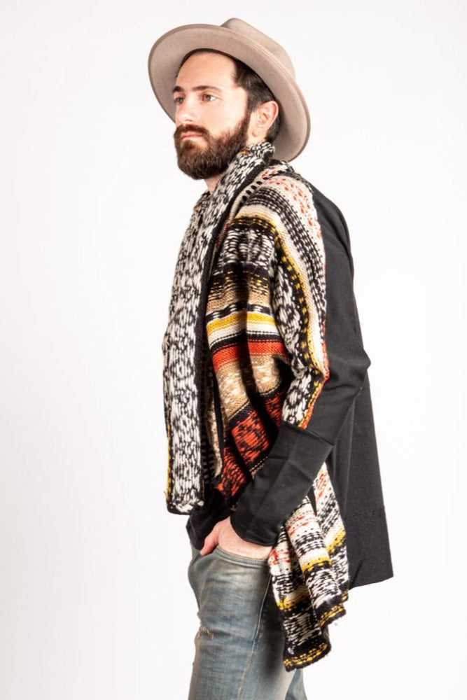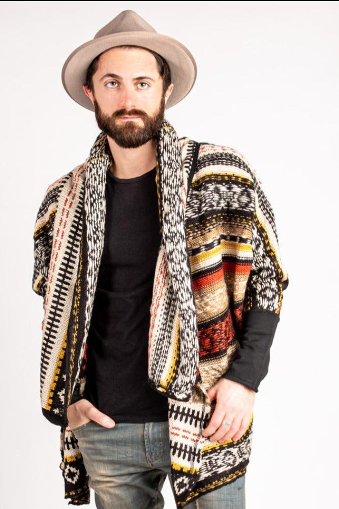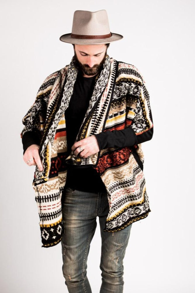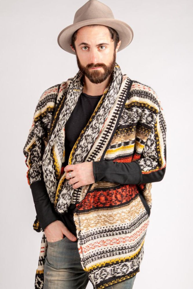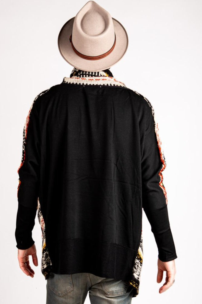 Tribal patterned shawl style cardigan with high-low hem and contrast back panel and cuff sleeves.