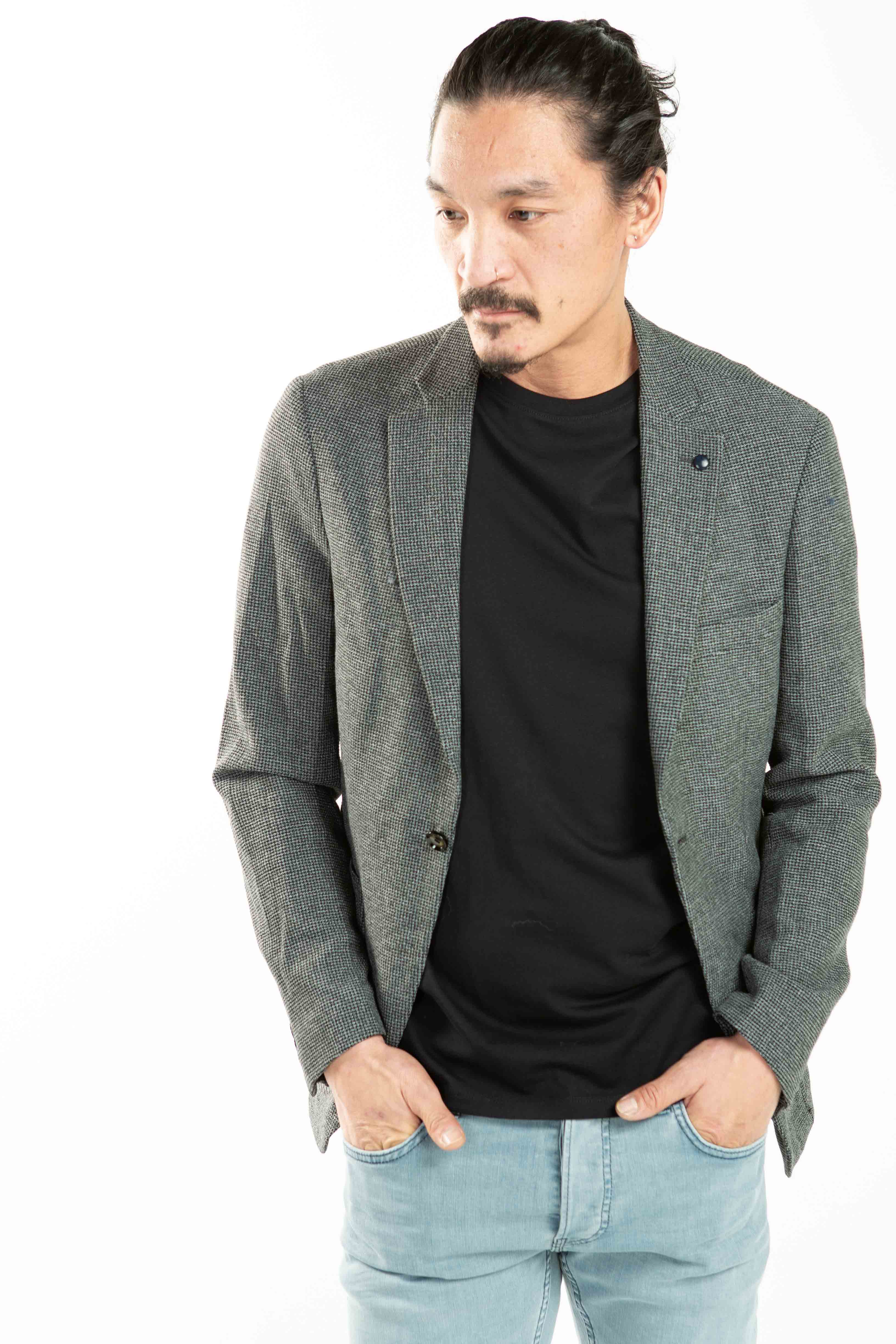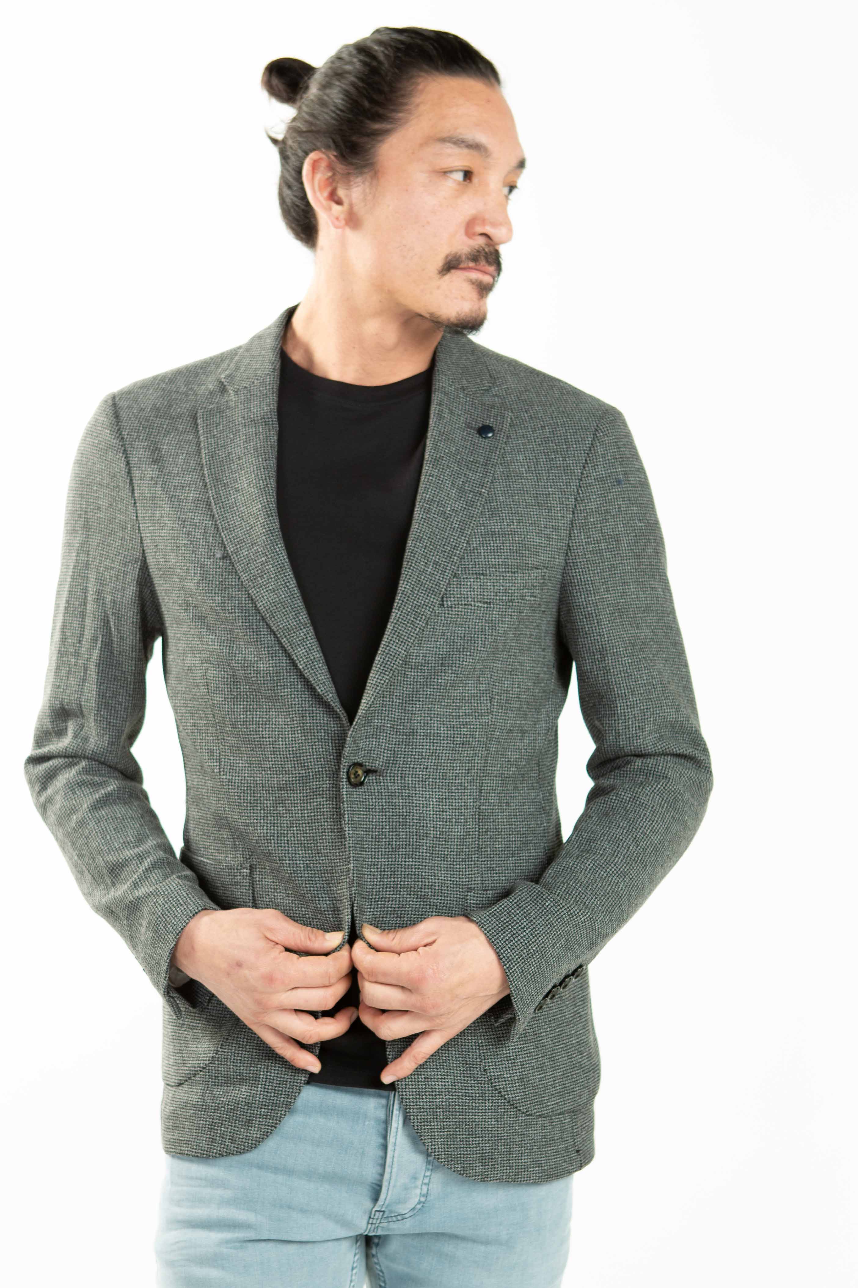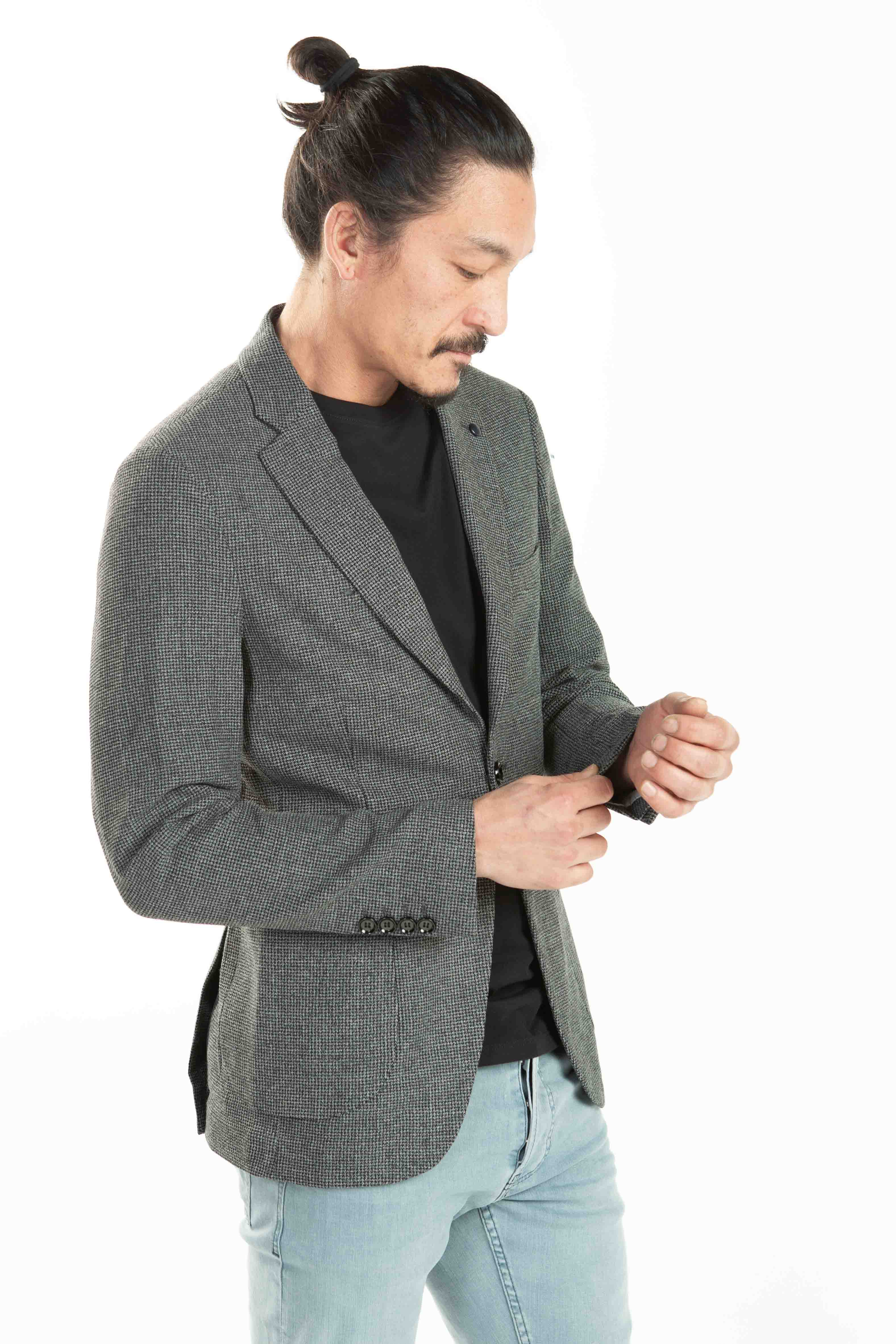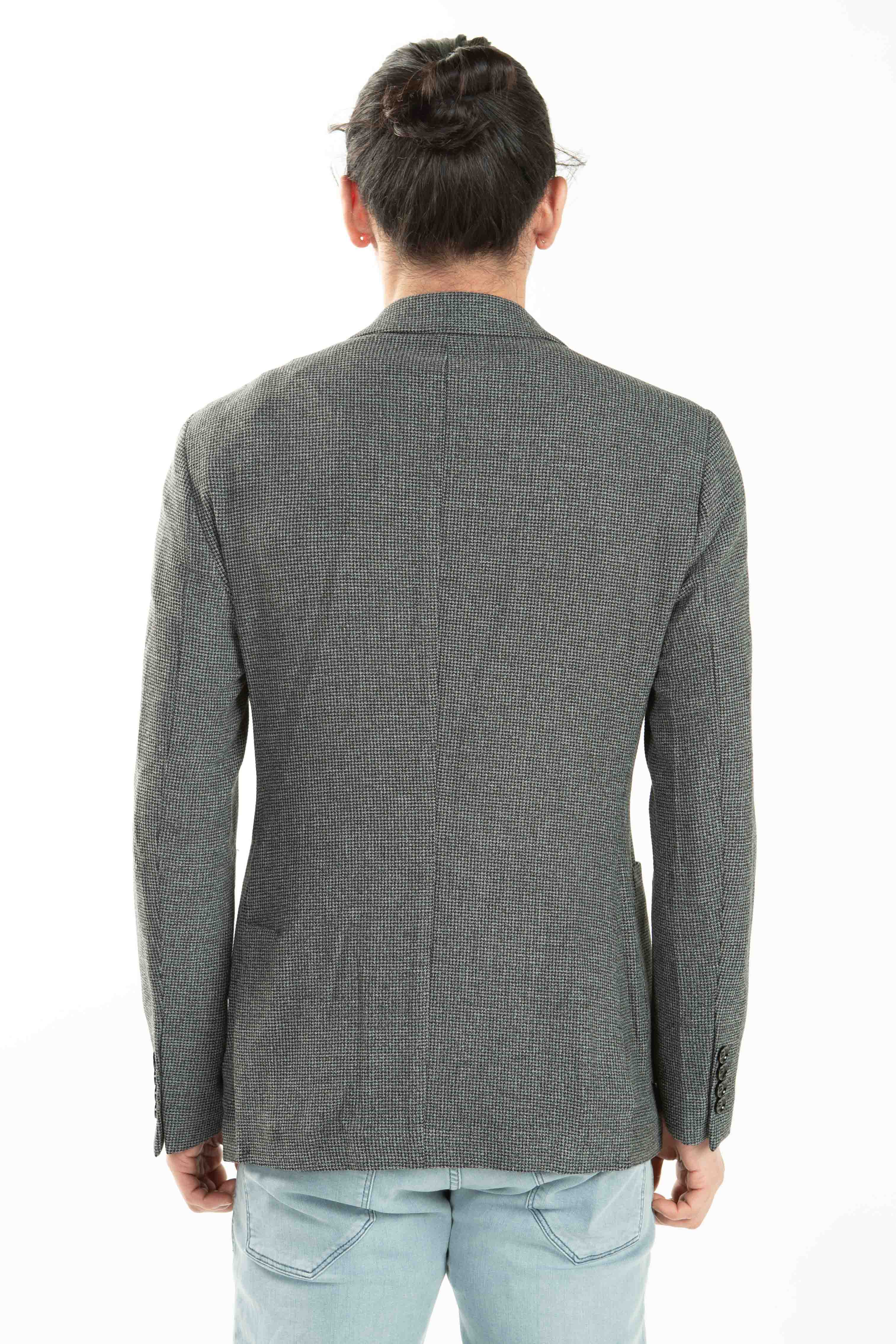 Men's long-sleeved single buttoned blazer in grey. It also has a lapel collar with a pocket design and a patchwork for decoration.