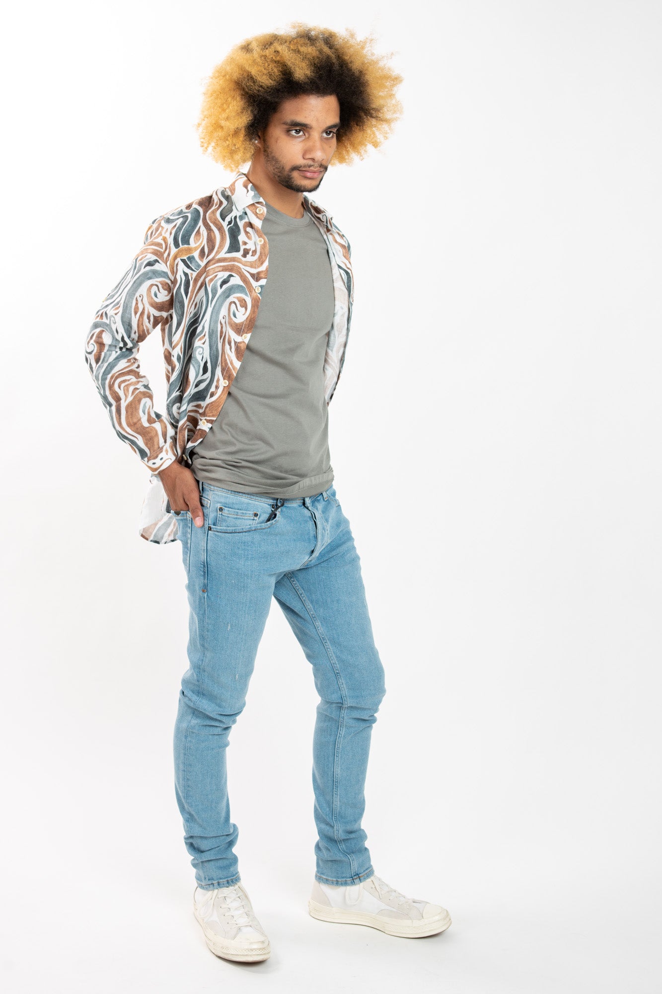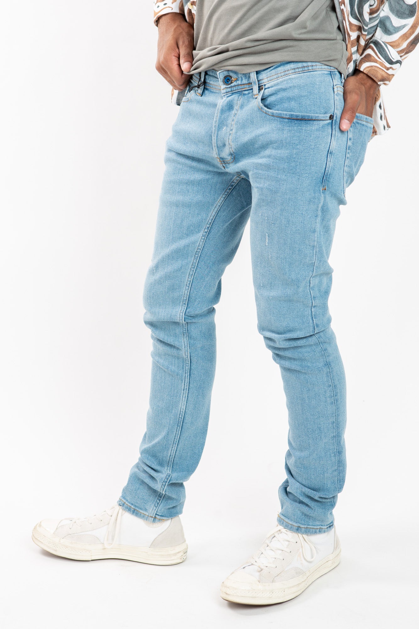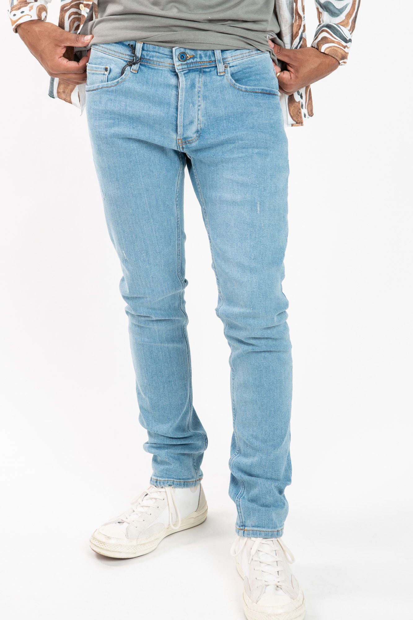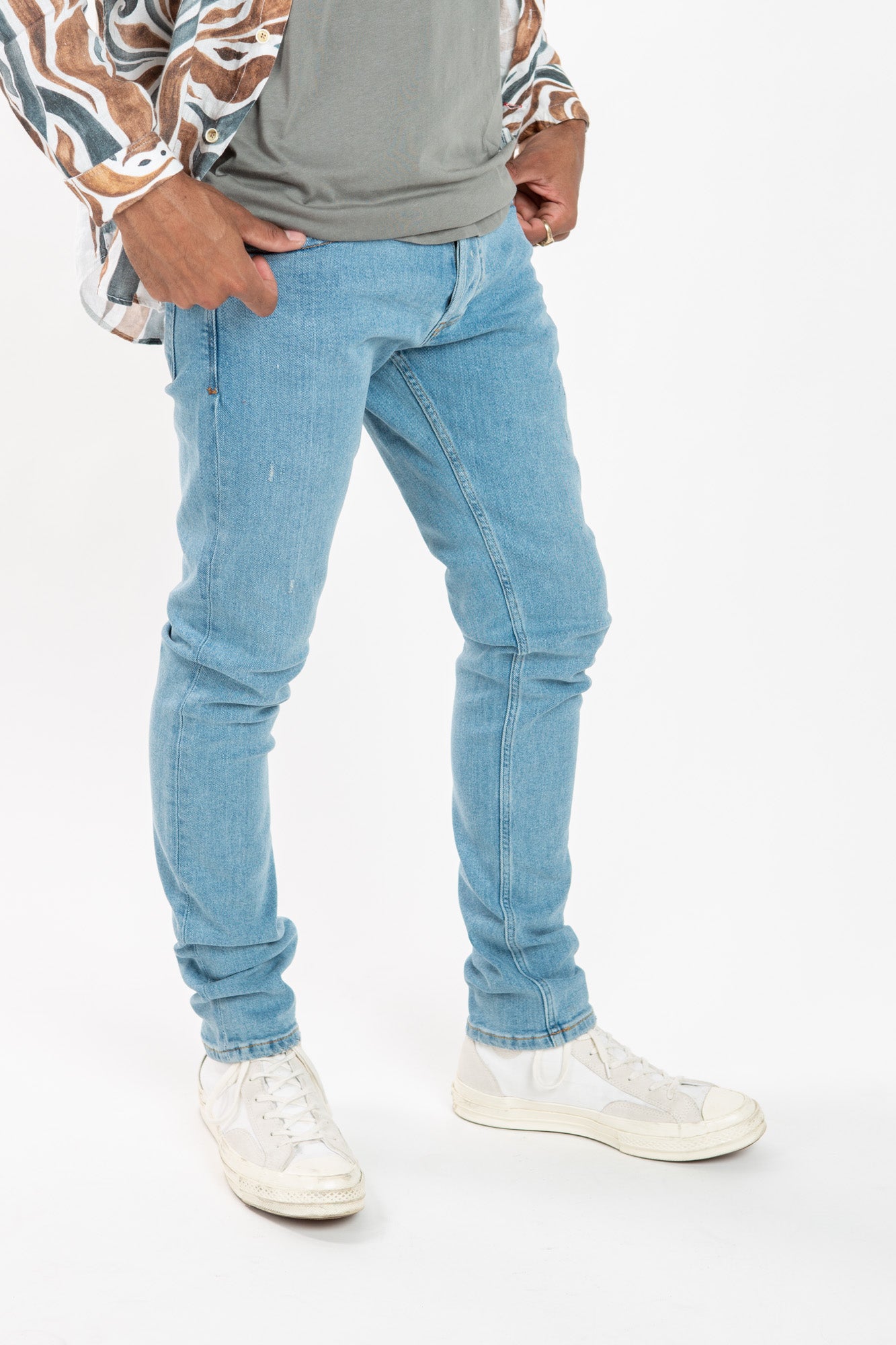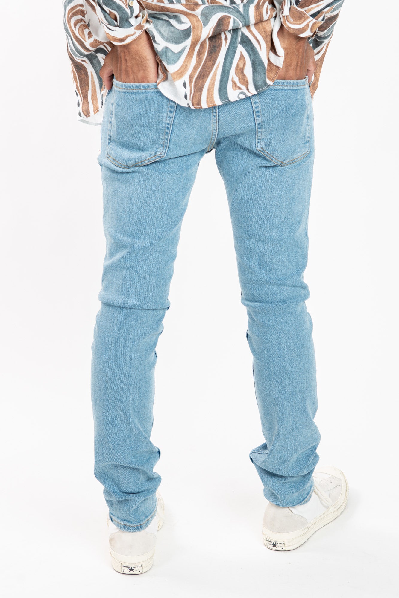 Stretch cotton denim jeans in slim fit silhouette finished in a retro light wash.