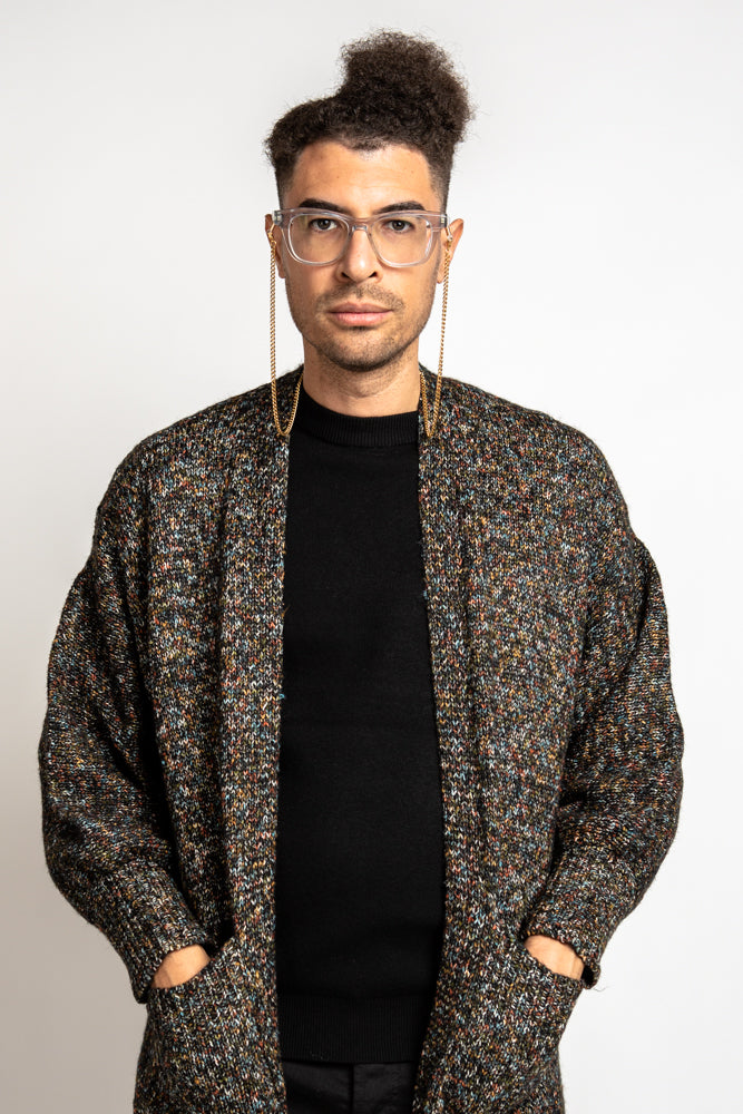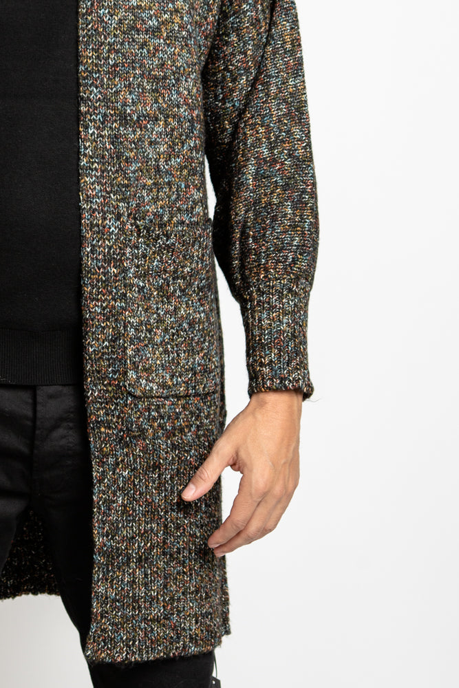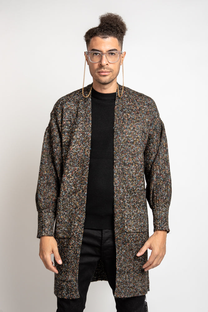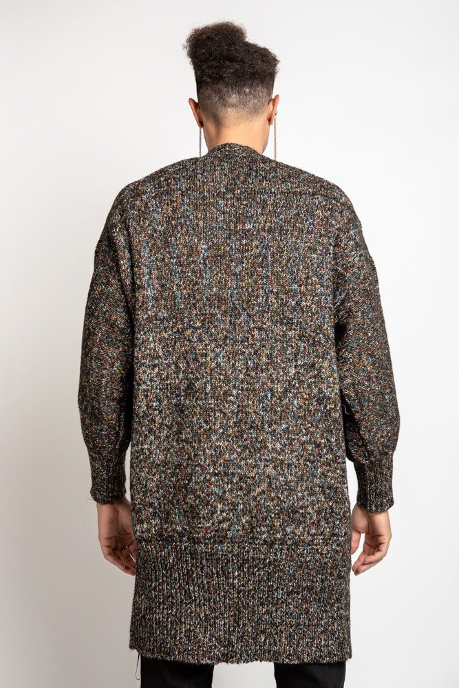 A beautiful speckled oversized cardigan featuring long bishop sleeves, two side pockets, and ribbed detail throughout.