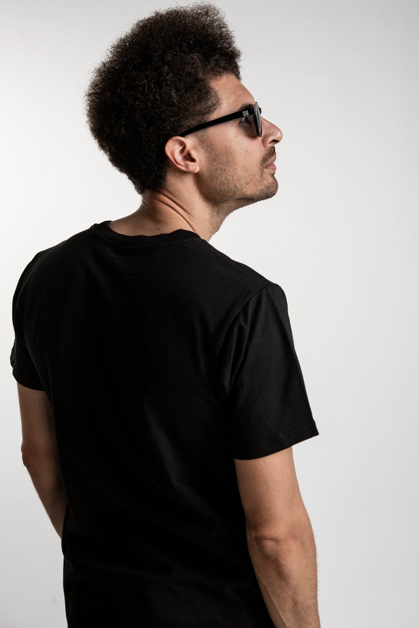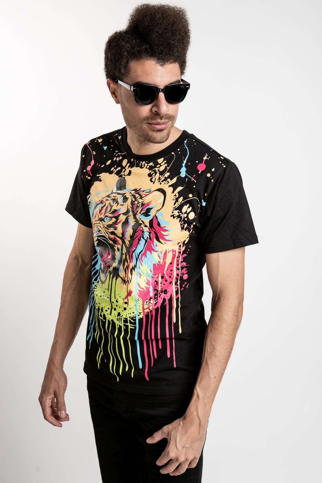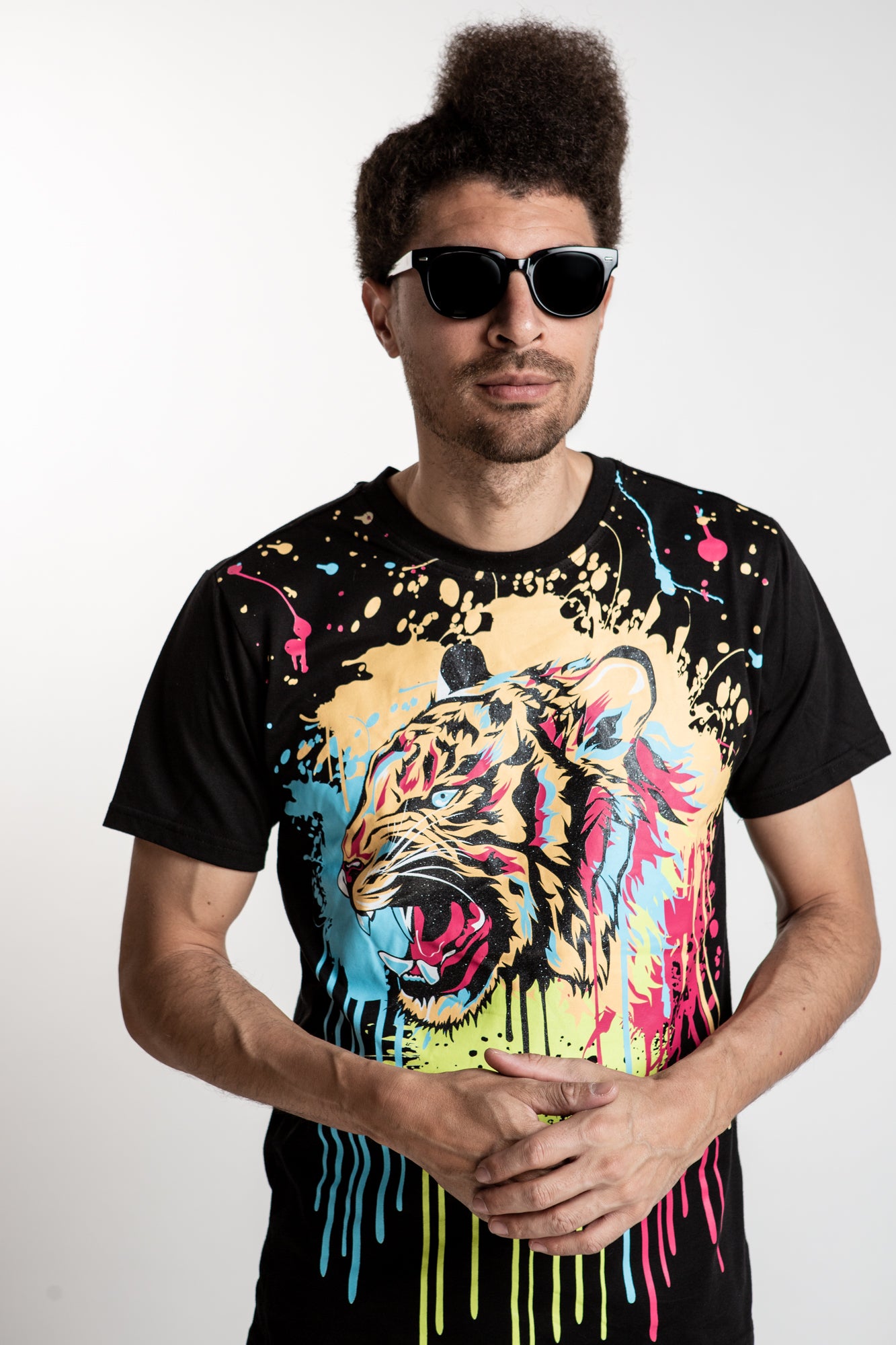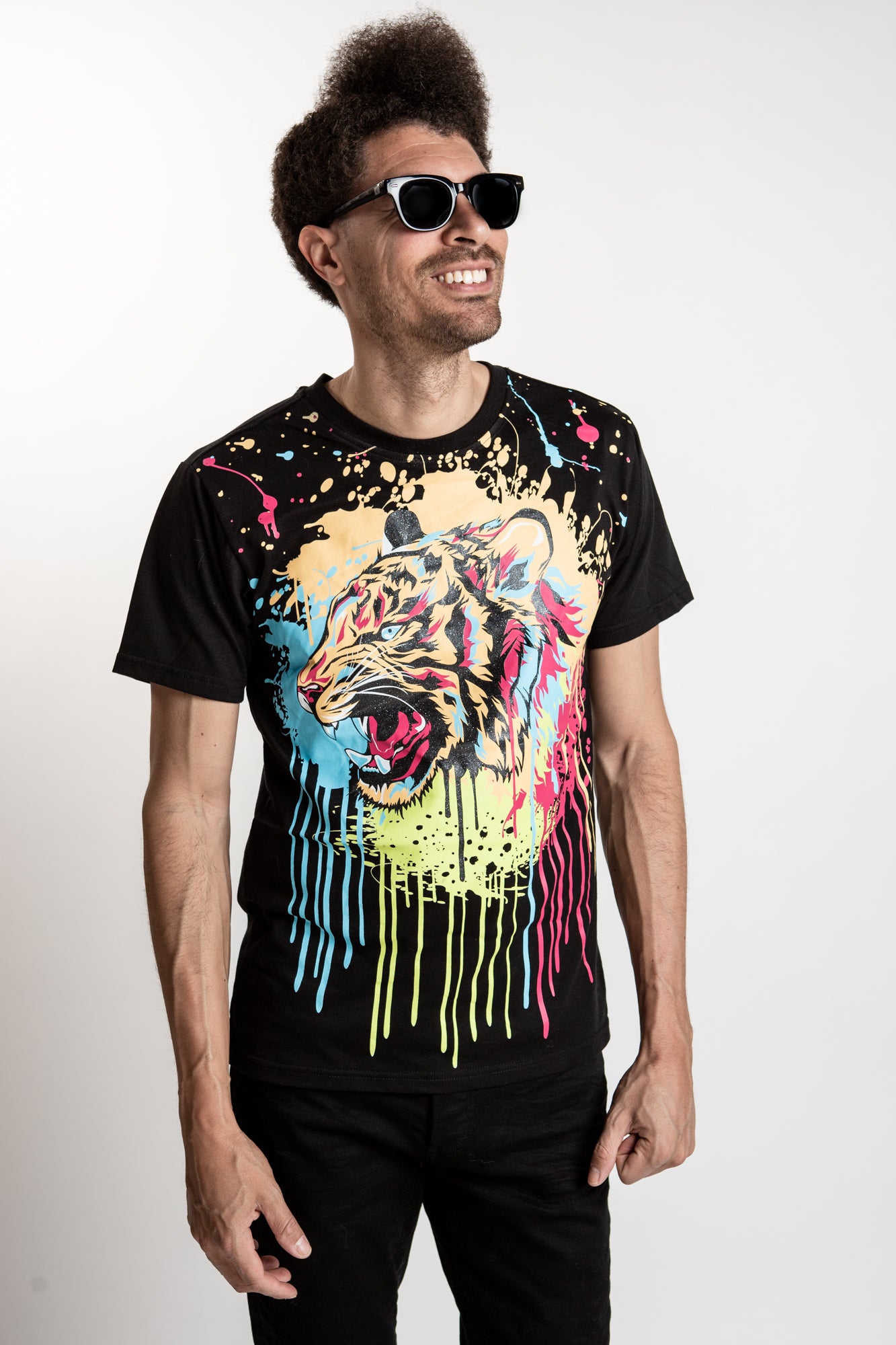 Men's short sleeve crew neck shirt in white with Splash Tiger print. Accent black neck line.
