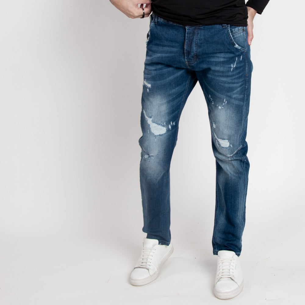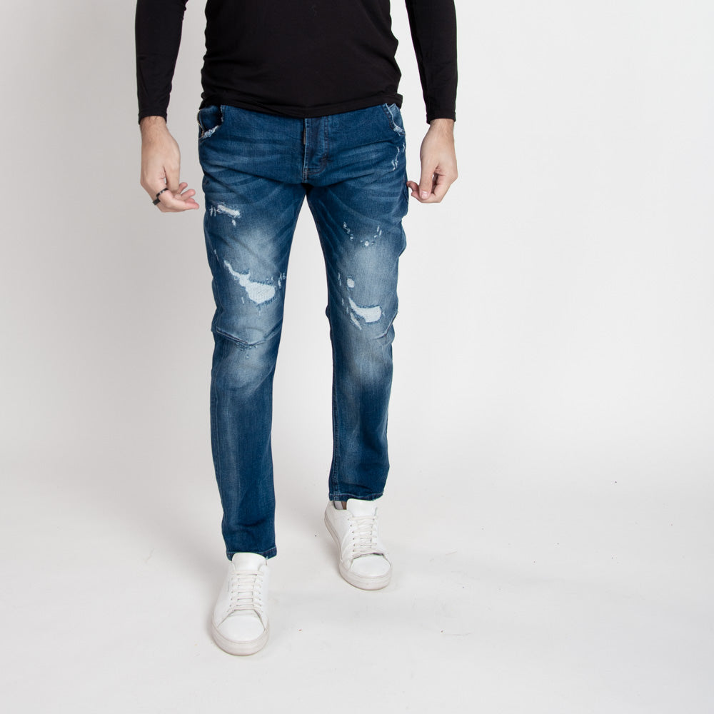 Distressed details give these classic tapered stretchy jeans a contemporary edge.