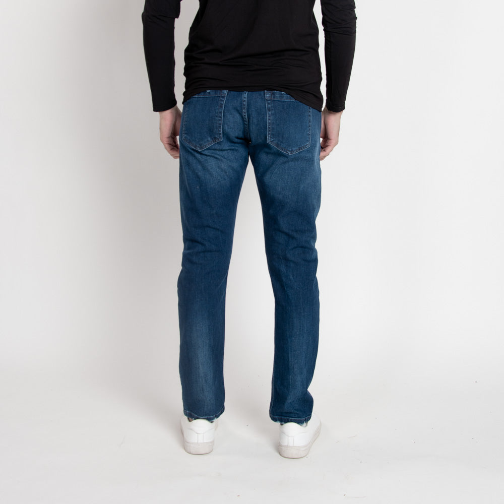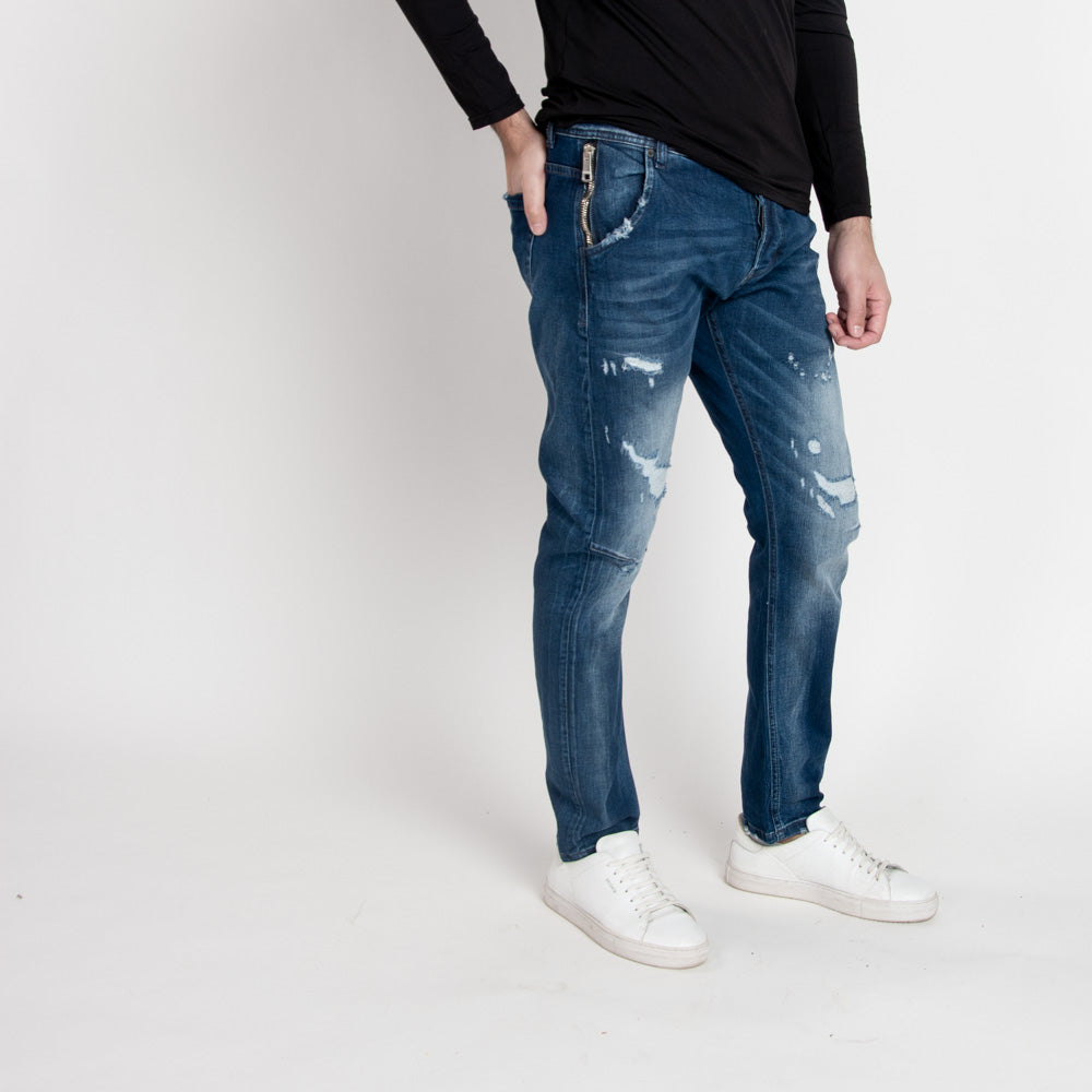 Five-pocket style with a vertical zipper accent on the left front pocket. Mid wash denim with subtle rip and repair design detailing.