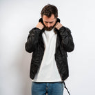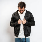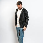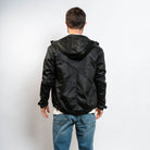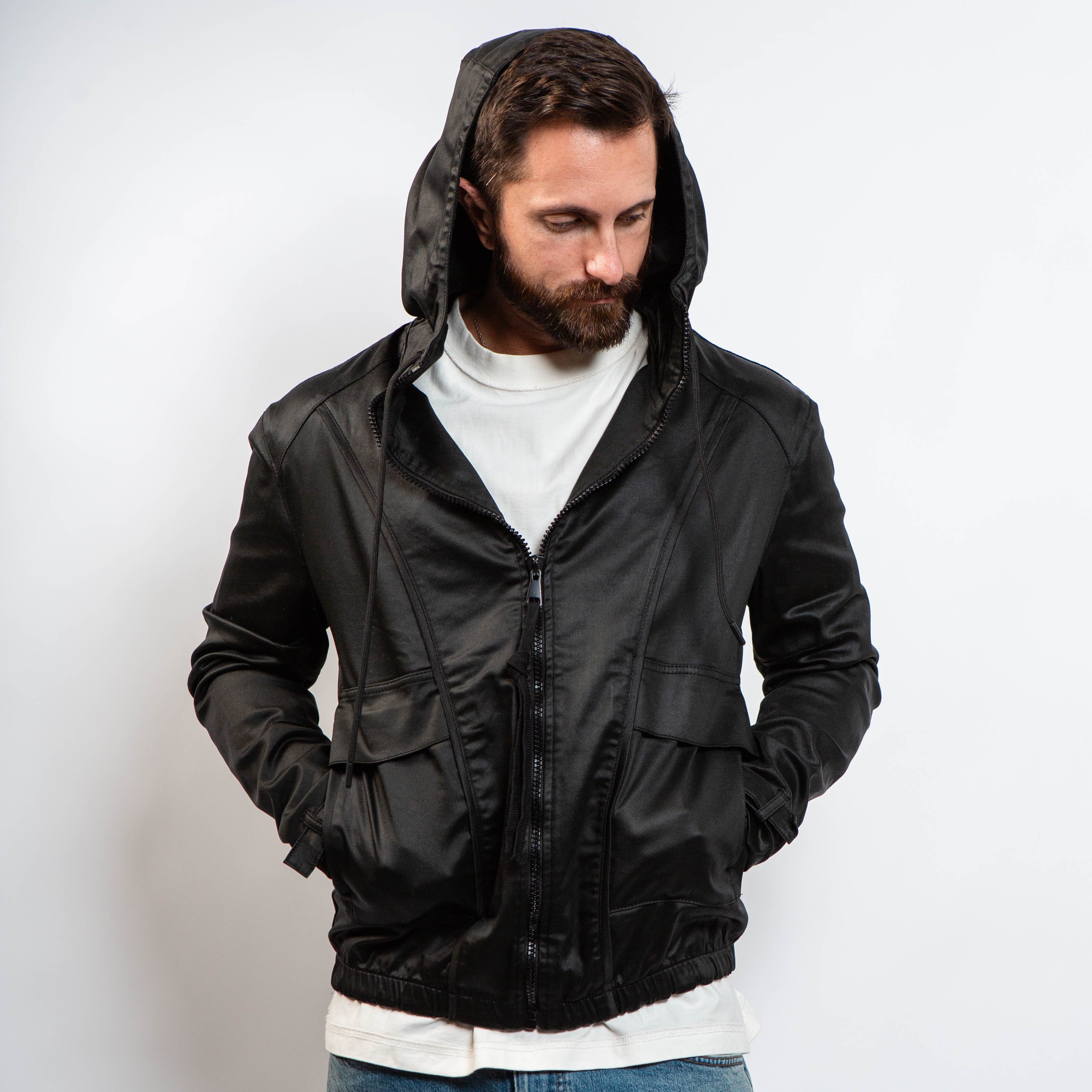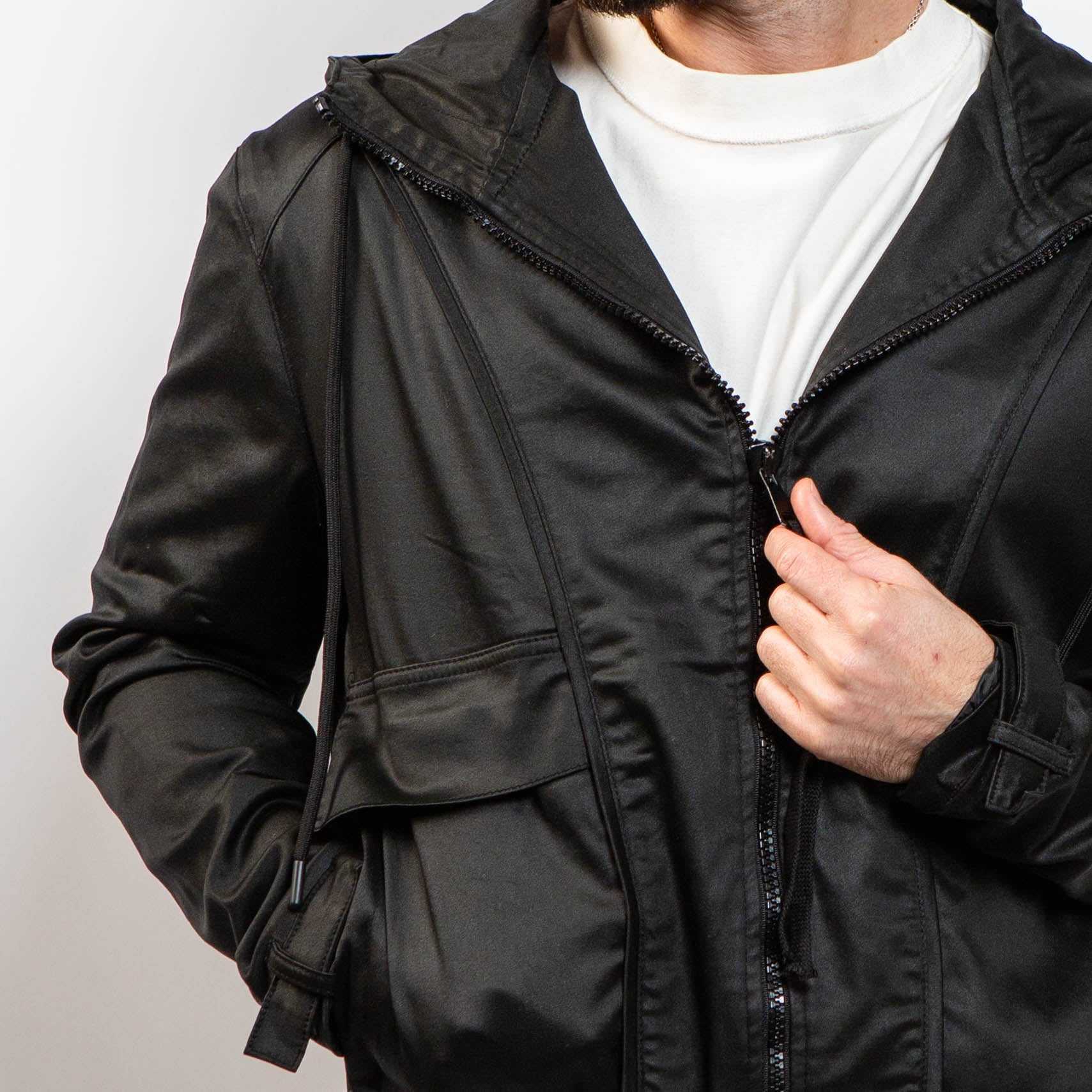 A structured essential for the modern man. This black waxed jacket combines urban edge with refined detail — featuring articulated seams, a sculpted hood, and oversized front flap pockets. The waxed finish gives a subtle sheen and weather-resistant texture, while the elastic hem and full zip closure create a clean, versatile fit. A statement layer that moves seamlessly from street to studio.