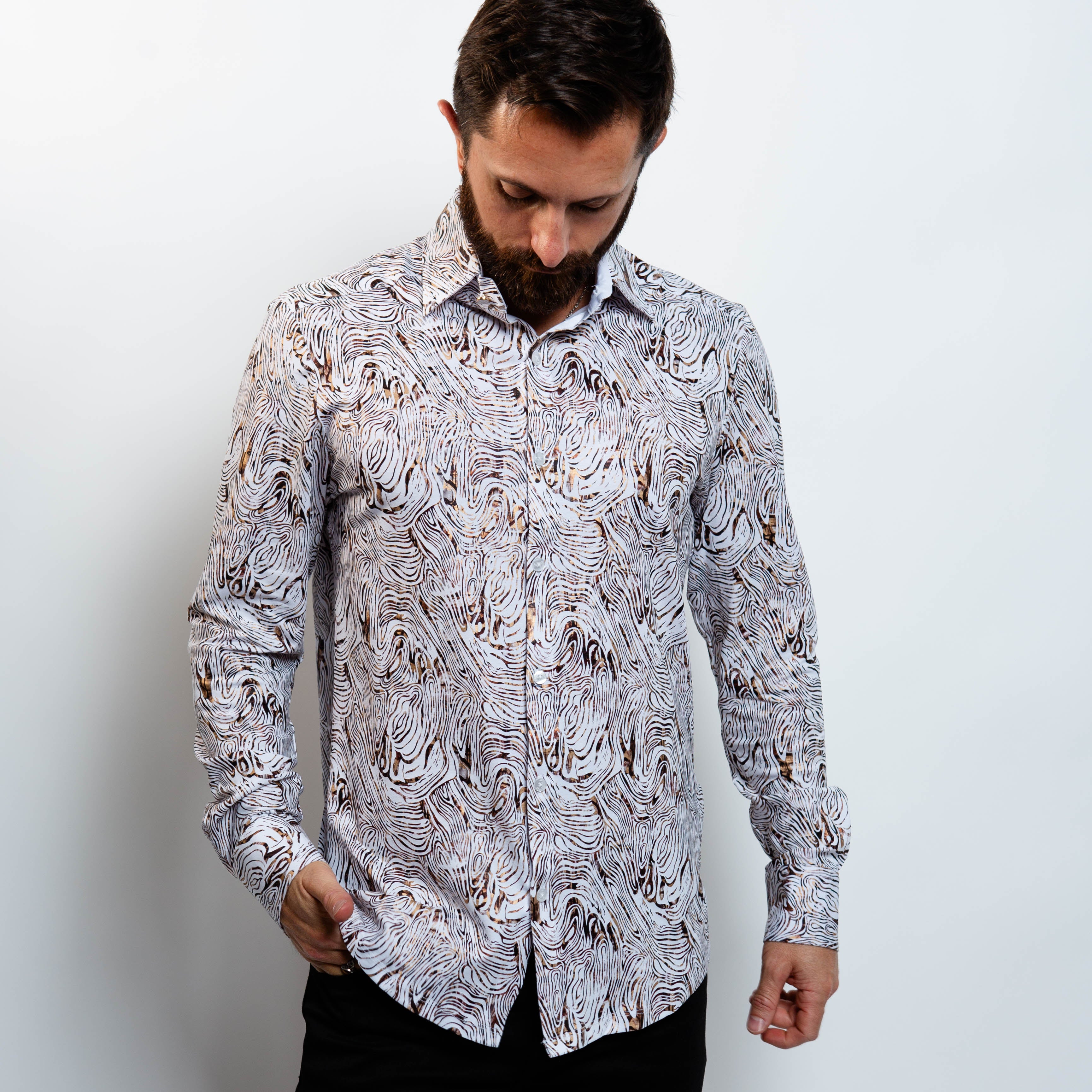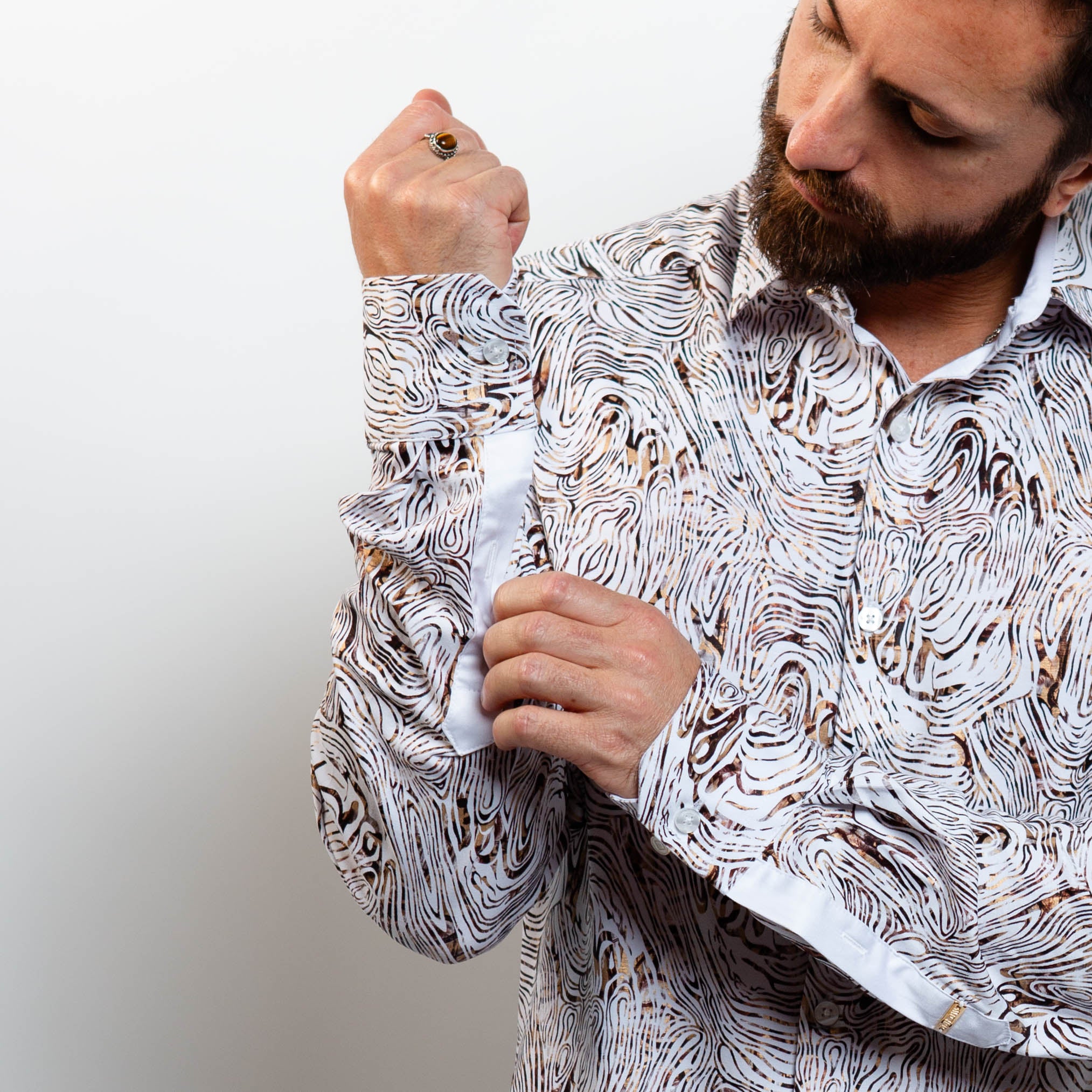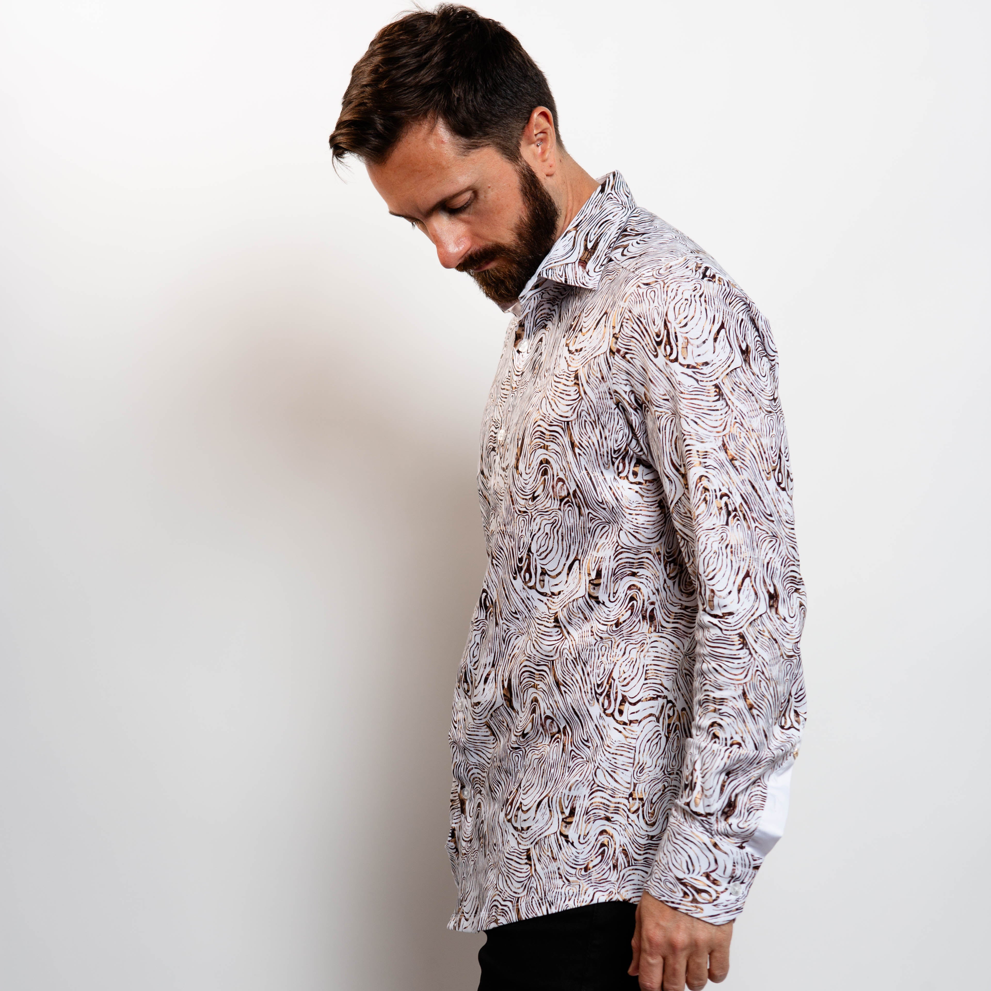 Organic chaos meets tailored cool. The Terra Swirl Shirt features a hypnotic all-over print that flows like tree rings or wind-carved sand—each line a nod to nature’s unpredictable beauty. Rendered in earthy browns and blacks over a crisp white base, it’s a bold yet wearable piece that adds movement and intrigue to any outfit.