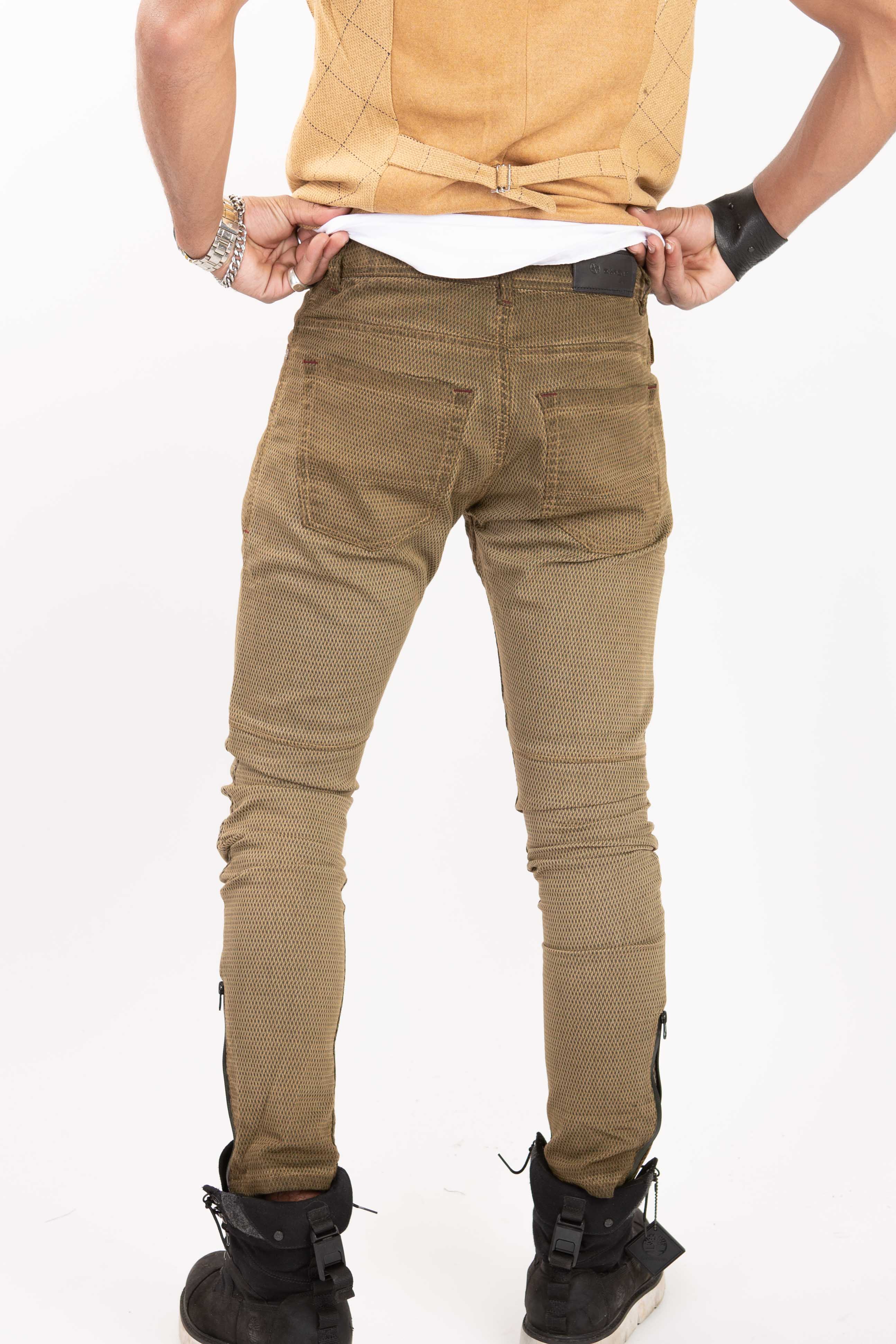 Mens textured denim pants, skinny fit with accent zippers at ankle cuffs.