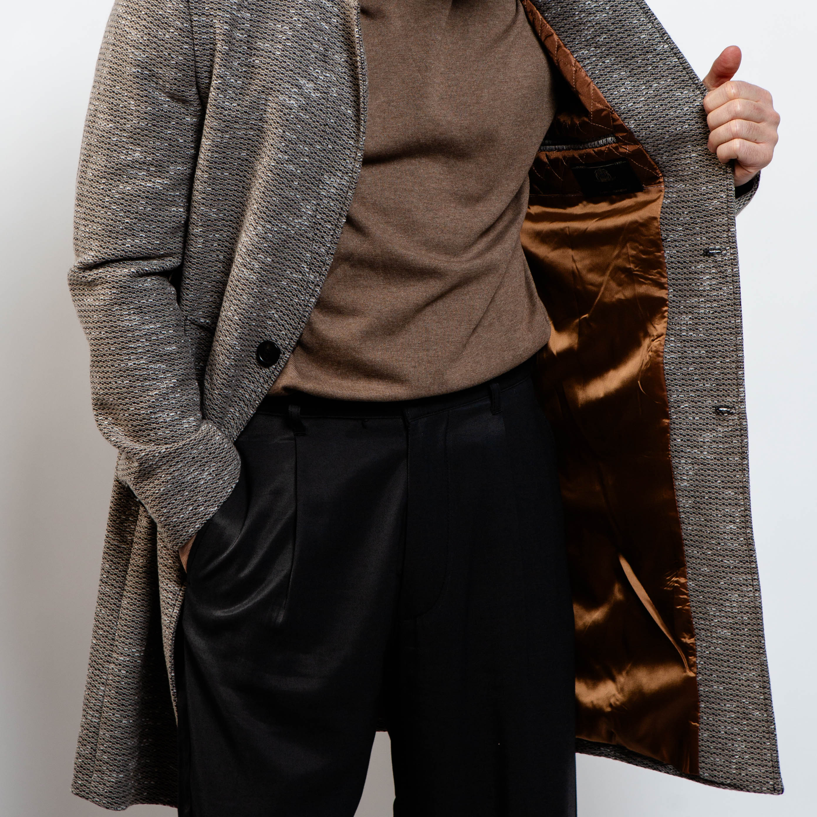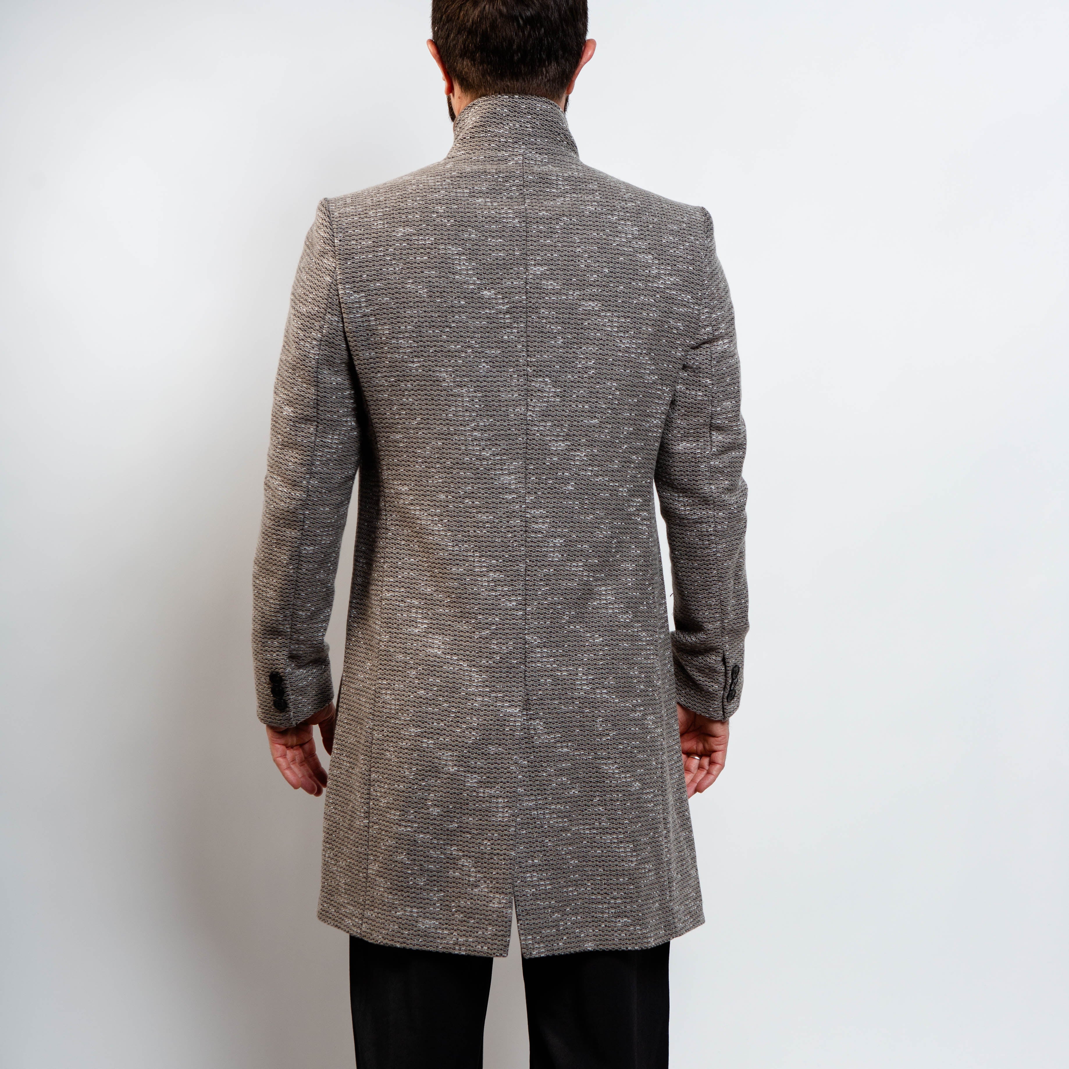 Sophisticated yet effortless, this Men’s Textured Wool Peacoat in ash grey mélange redefines modern refinement. Crafted from a premium wool blend with a rich tactile weave, it offers structure and warmth without bulk. The tailored silhouette features a minimal stand collar, subtle front pockets, and a streamlined two-button closure — a clean update to the traditional pea coat. The tonal texture catches the light beautifully, creating quiet depth and understated luxury. Perfect layered over a turtleneck or soft knit for winter elegance.