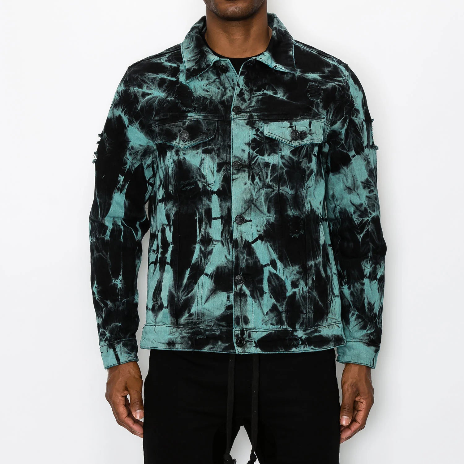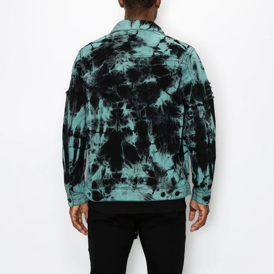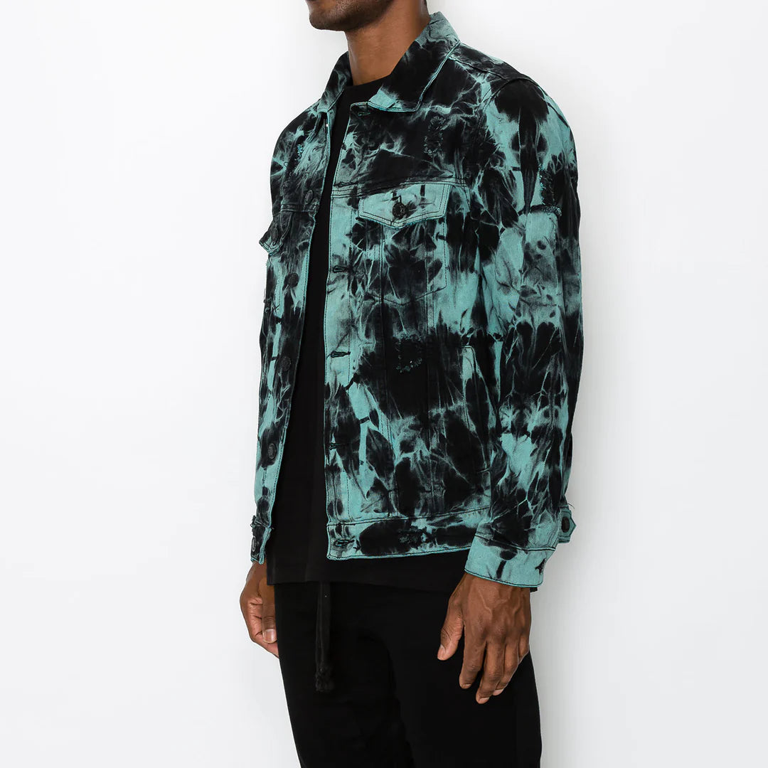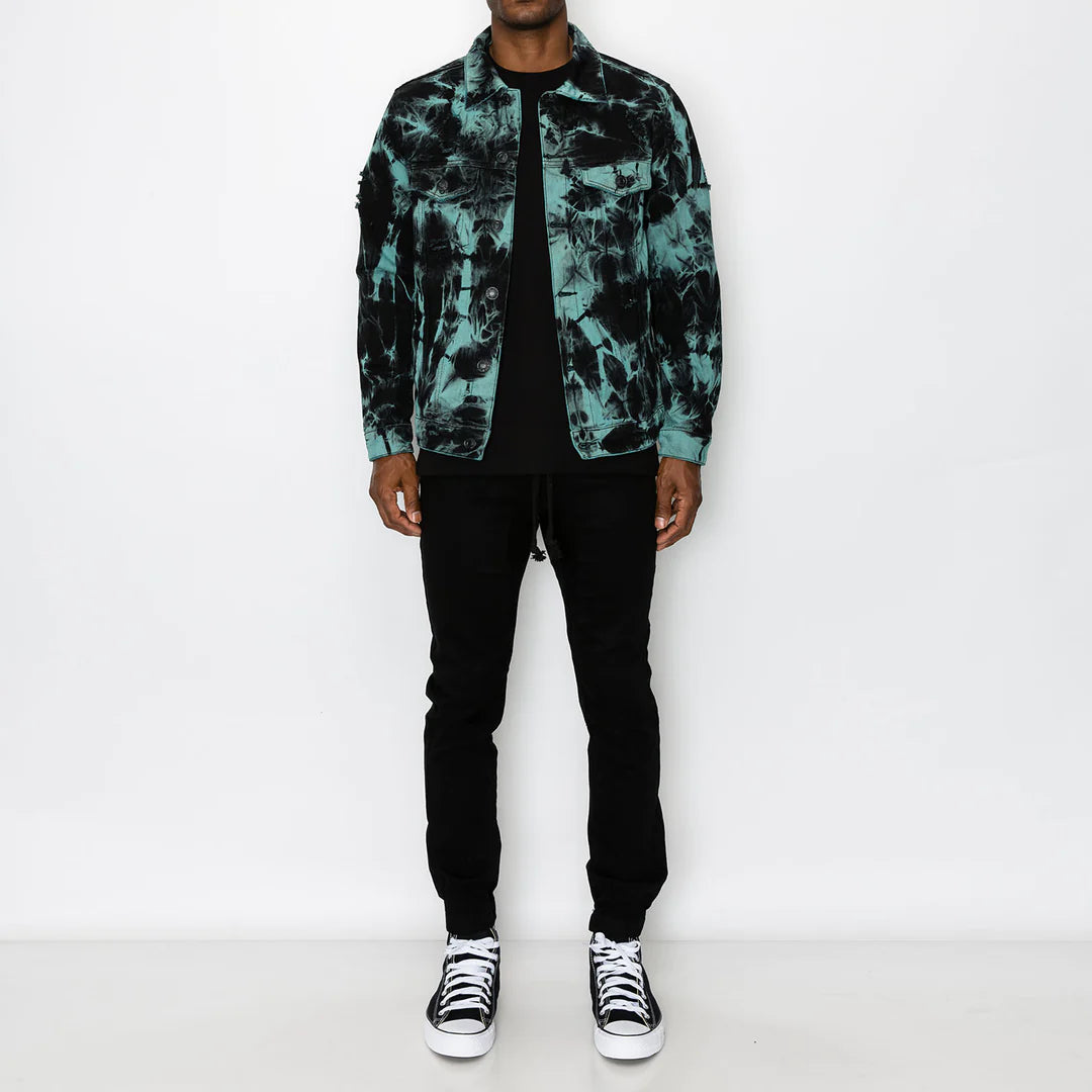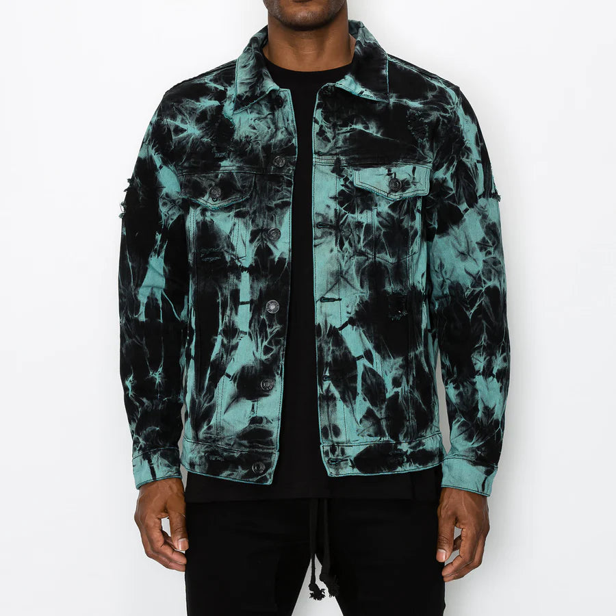 Conquer your style with our Tie Dye Denim Jacket inTeal! Made with 100% cotton denim, it features button closures, chest and slit pockets, distressed details, and a tie dye design. Perfect for bold individuals looking for a unique fashion statement. Available at BIA BORO Menswear in Gastown Vancouver.