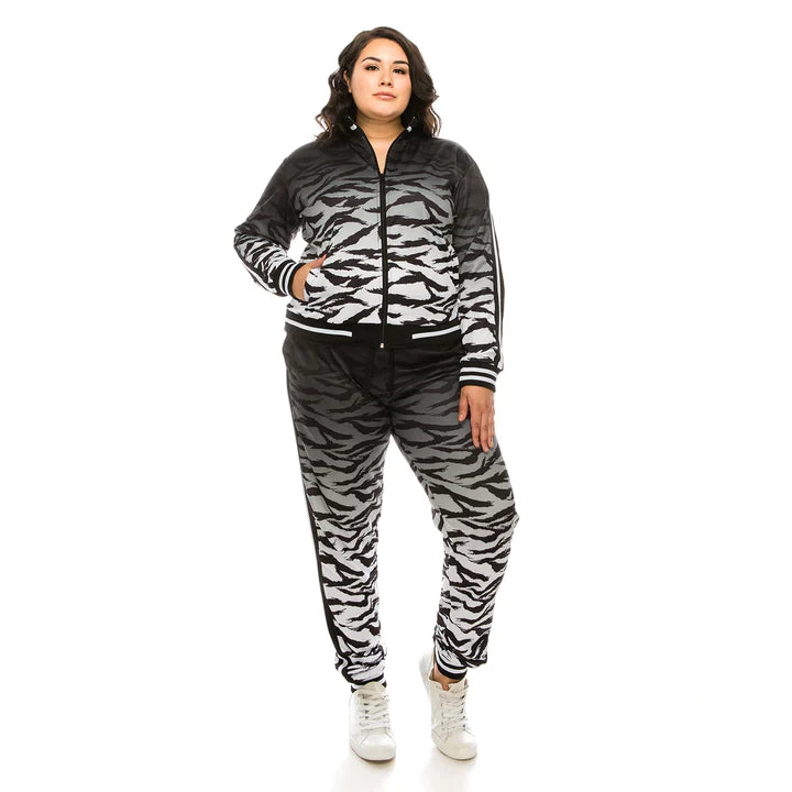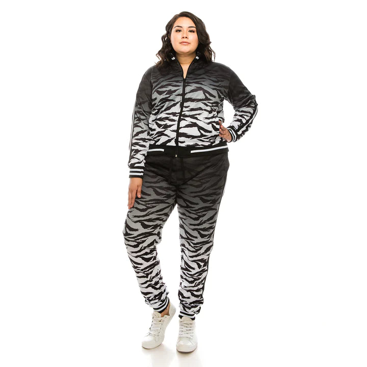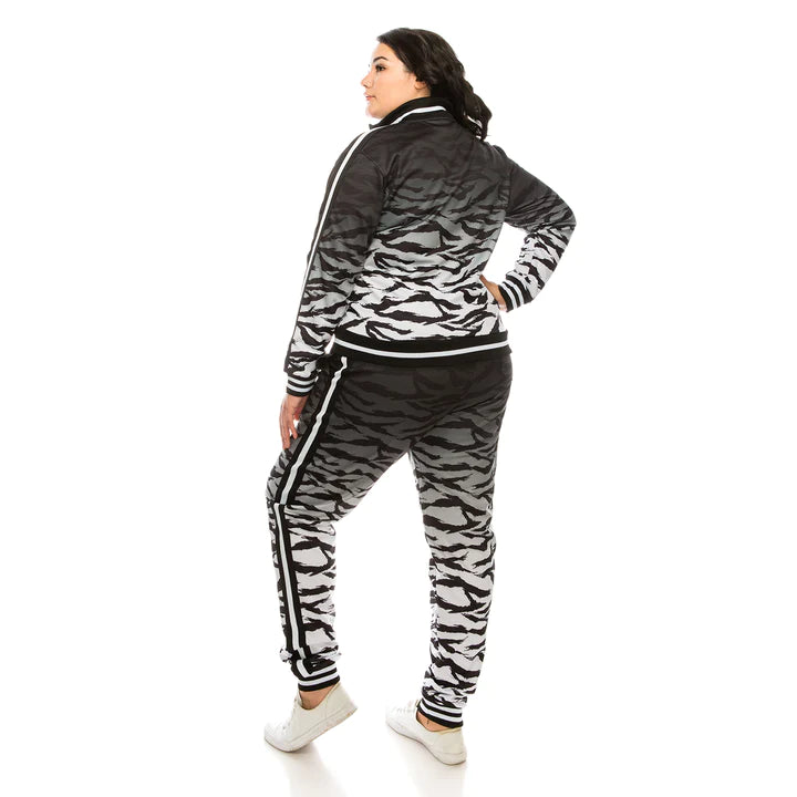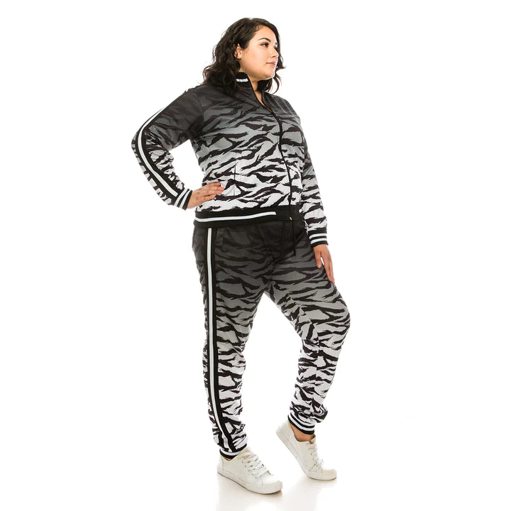 Unleash your inner risk-taker with the Tiger Camo Track Suit in Pink. This bold suit features elastic drawstring waist, ankle zippers, and elastic hems for a secure fit. Perfect for adventure seekers, the contrast stripe and pockets add functionality to the statement-making design. Available at Bia Boro in Gastown Vancouver.