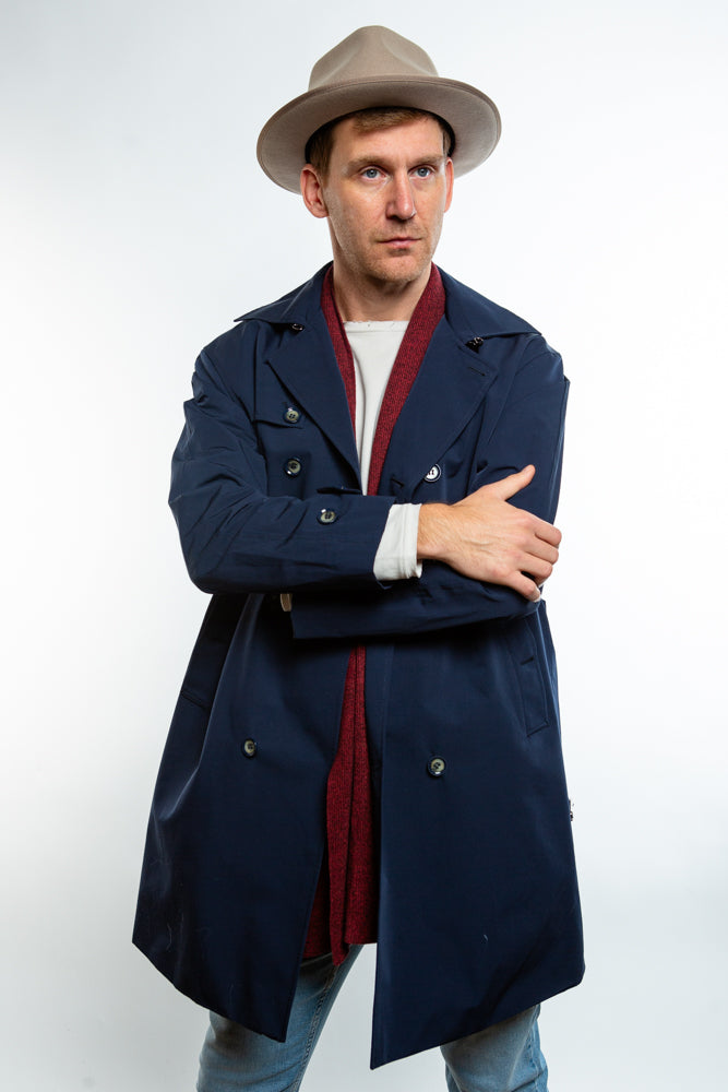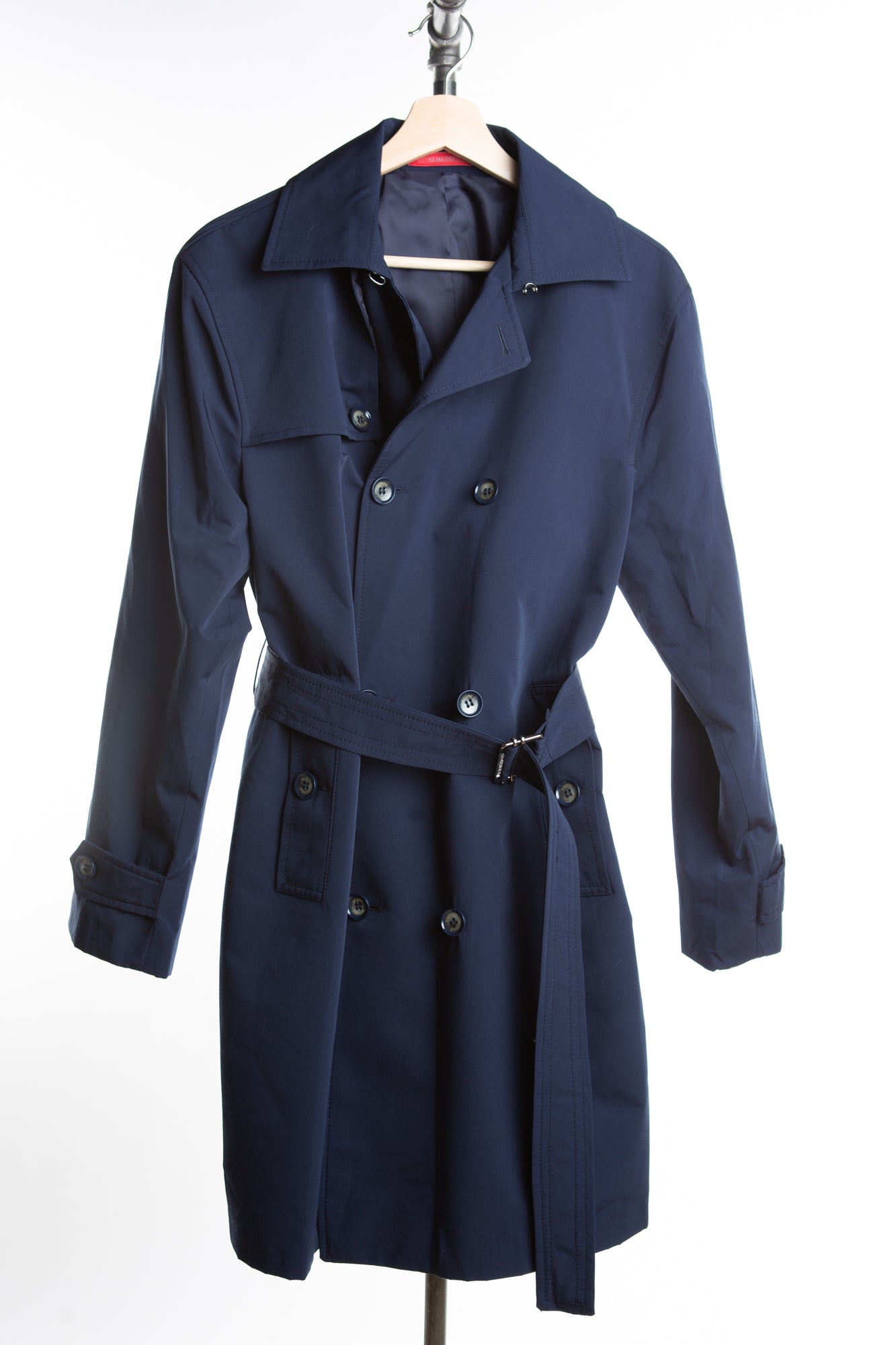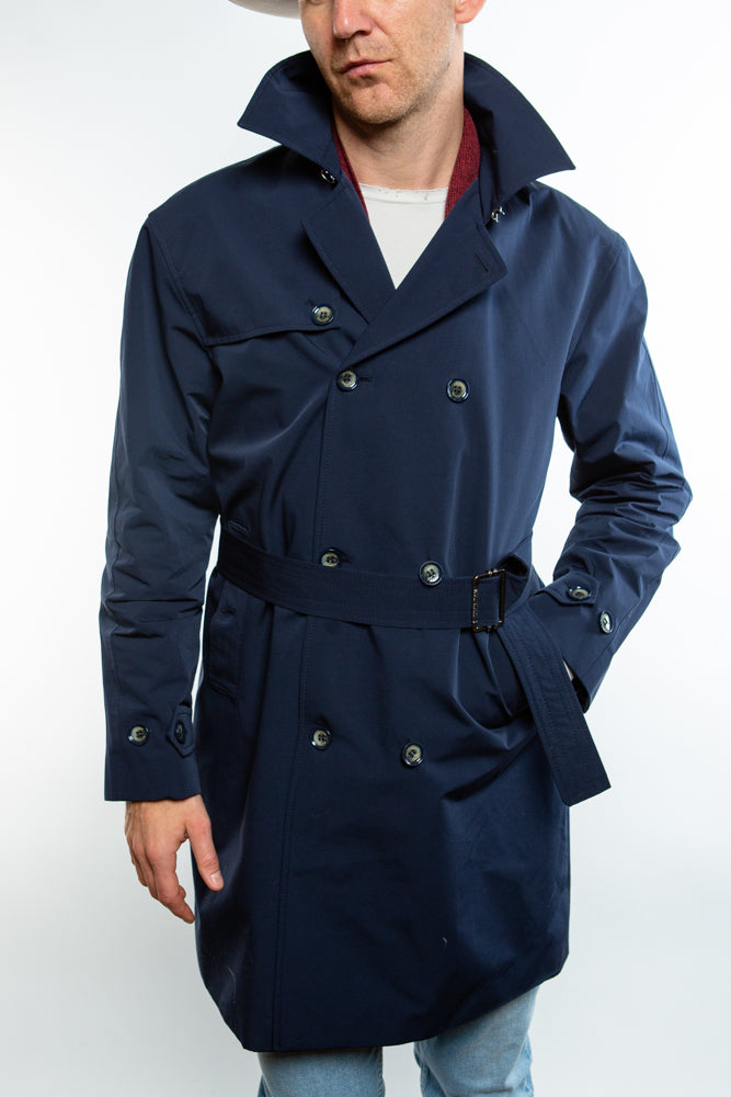 Experience the luxury of a classic navy double breasted trench coat. Expertly crafted with an elegant spread collar and adjustable belted waist, this timeless coat is designed with a water proof finish for unbeatable protection.