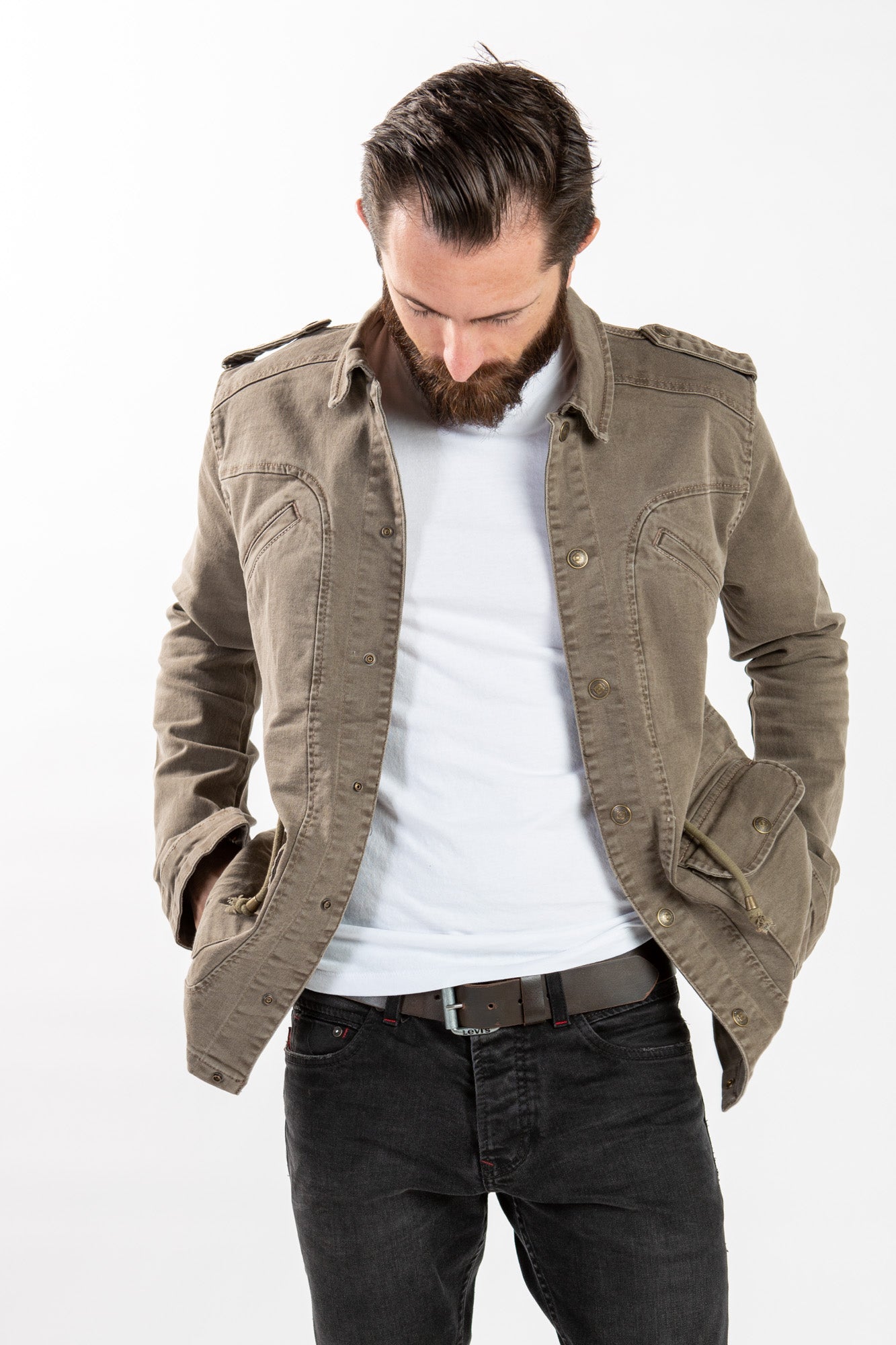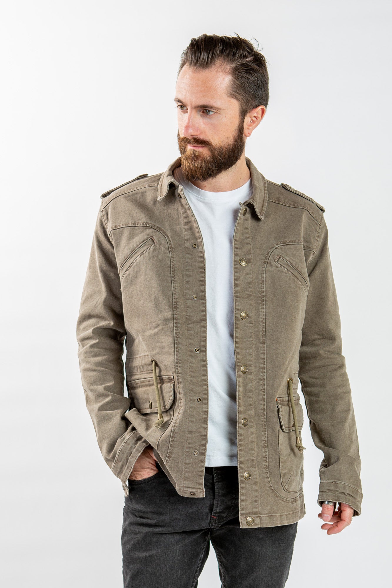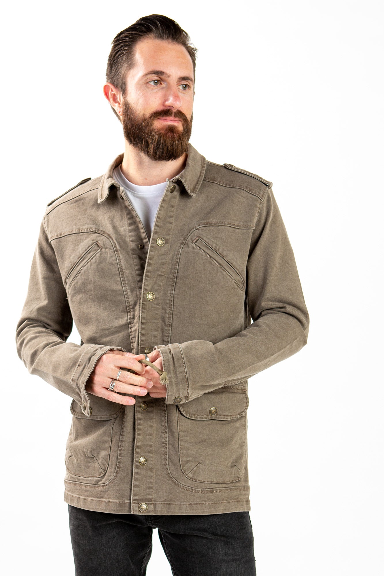 Lightweight classic collar utility jacket crafted in taupe denim.