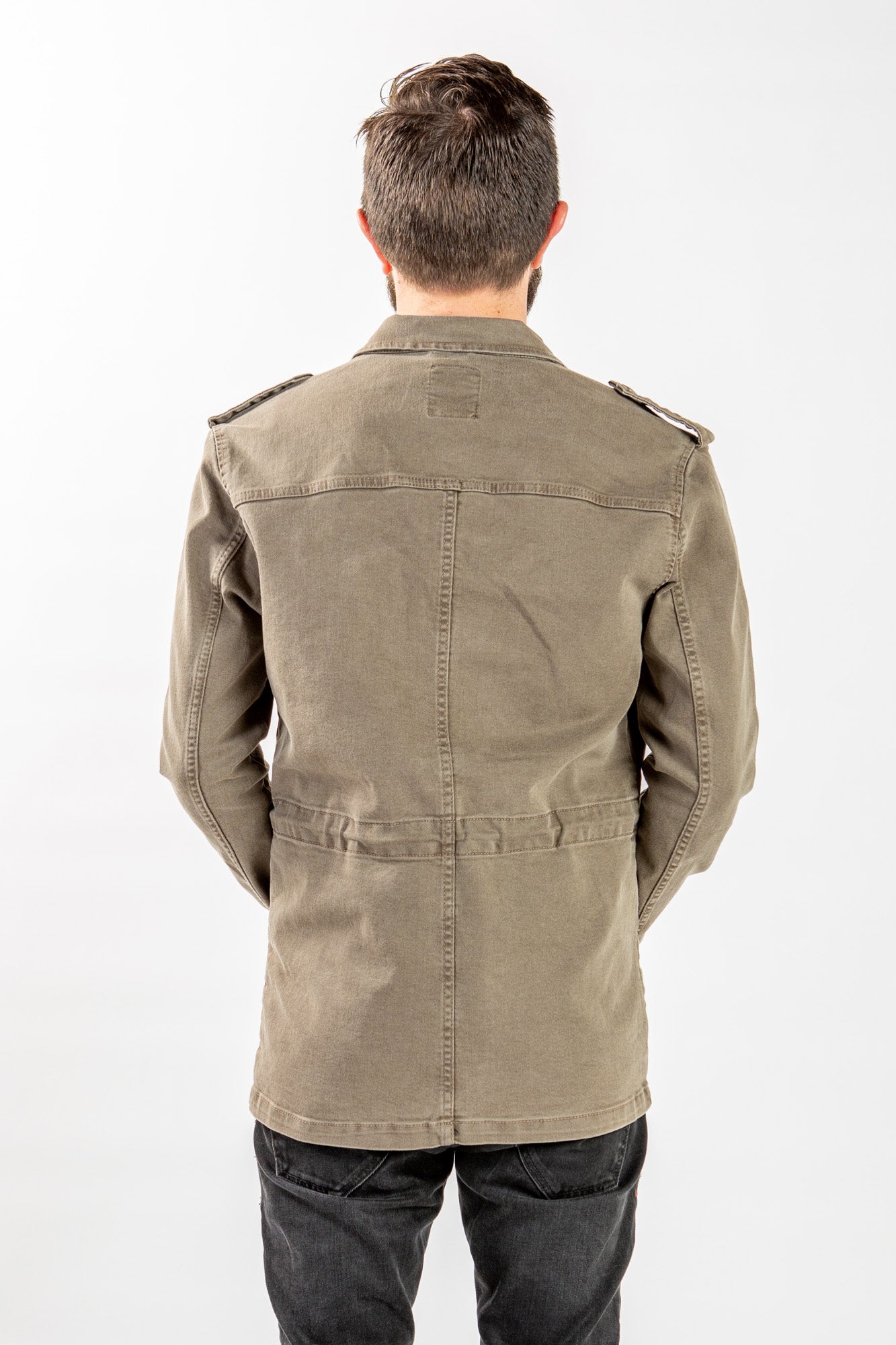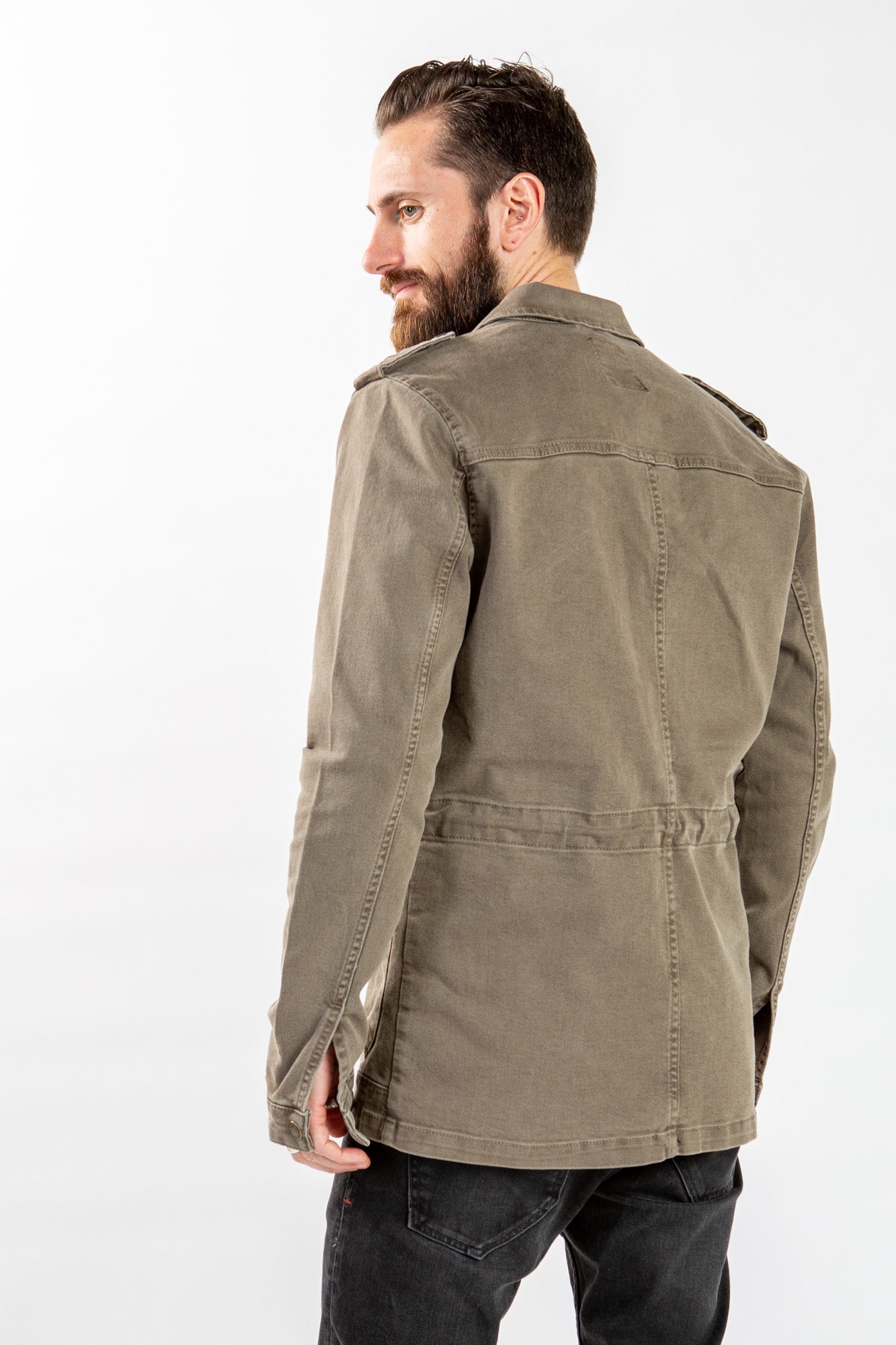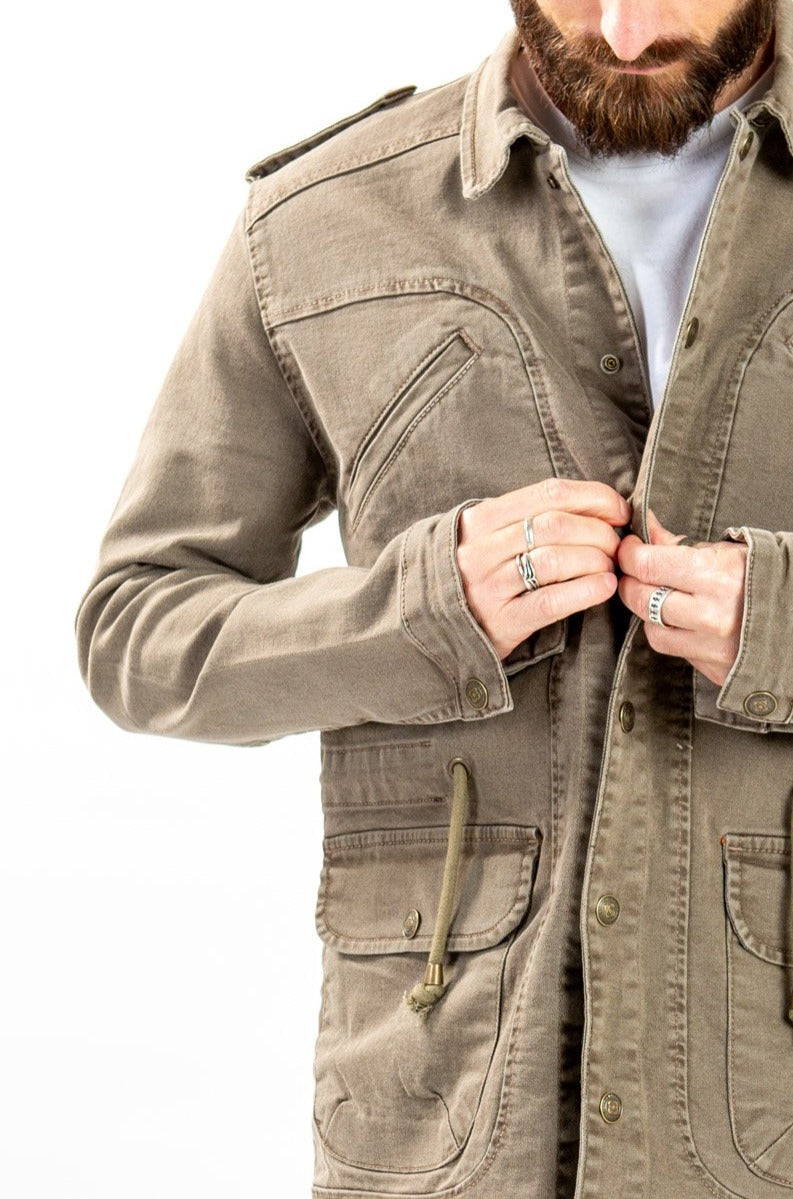 Lightweight classic collar utility jacket crafted in taupe denim.