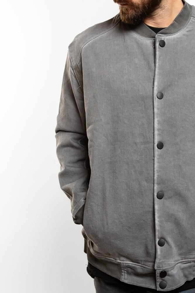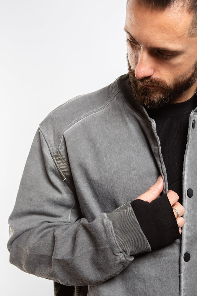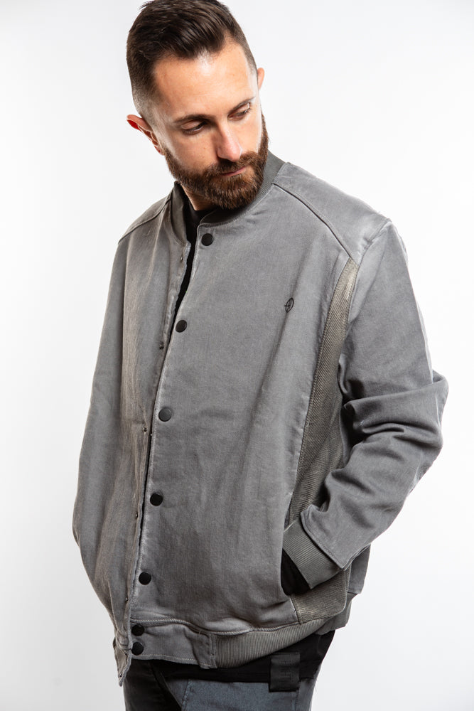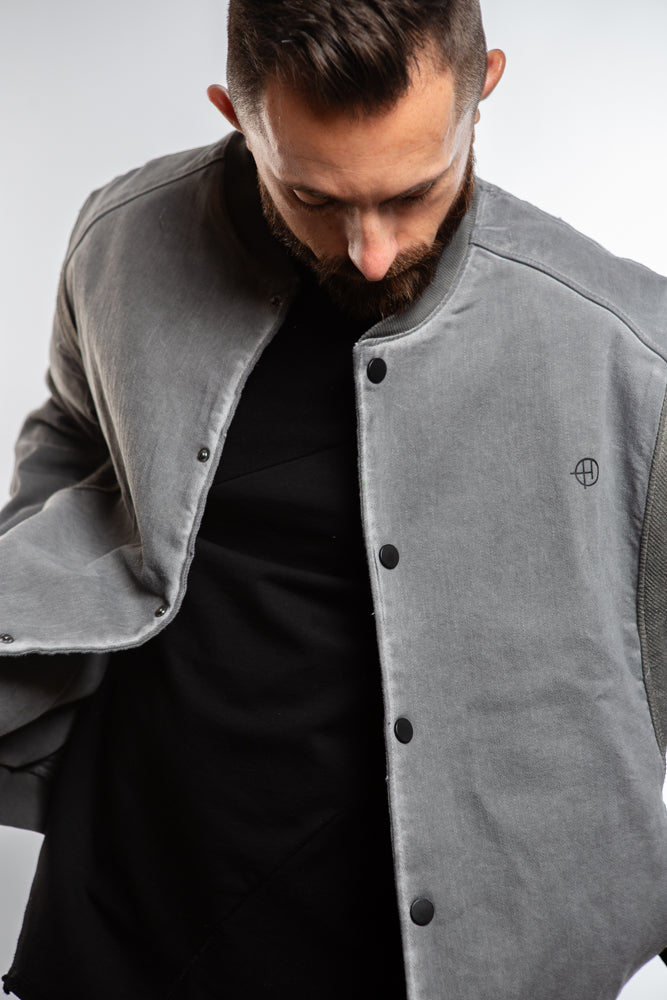 Introducing the Varsity Bomber in Grey. This college-style bomber combines a sleek, oversized fit with ribbed side panels and pockets for a touch of utilitarian charm. Crafted from premium denim fabric, it exudes effortless cool and is finished with a ribbed collar and button closure. Elevate your style with this luxurious and exclusive piece.