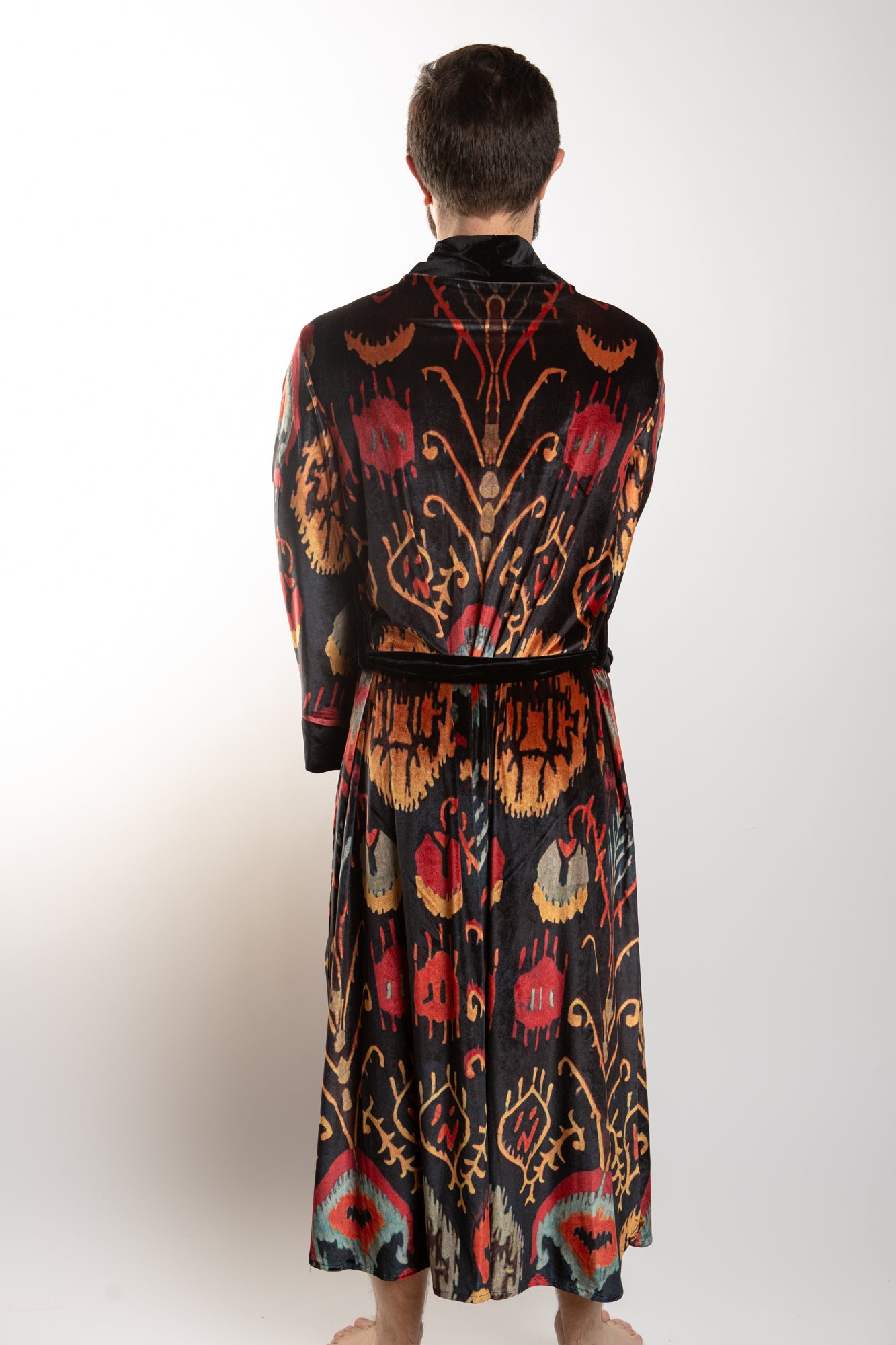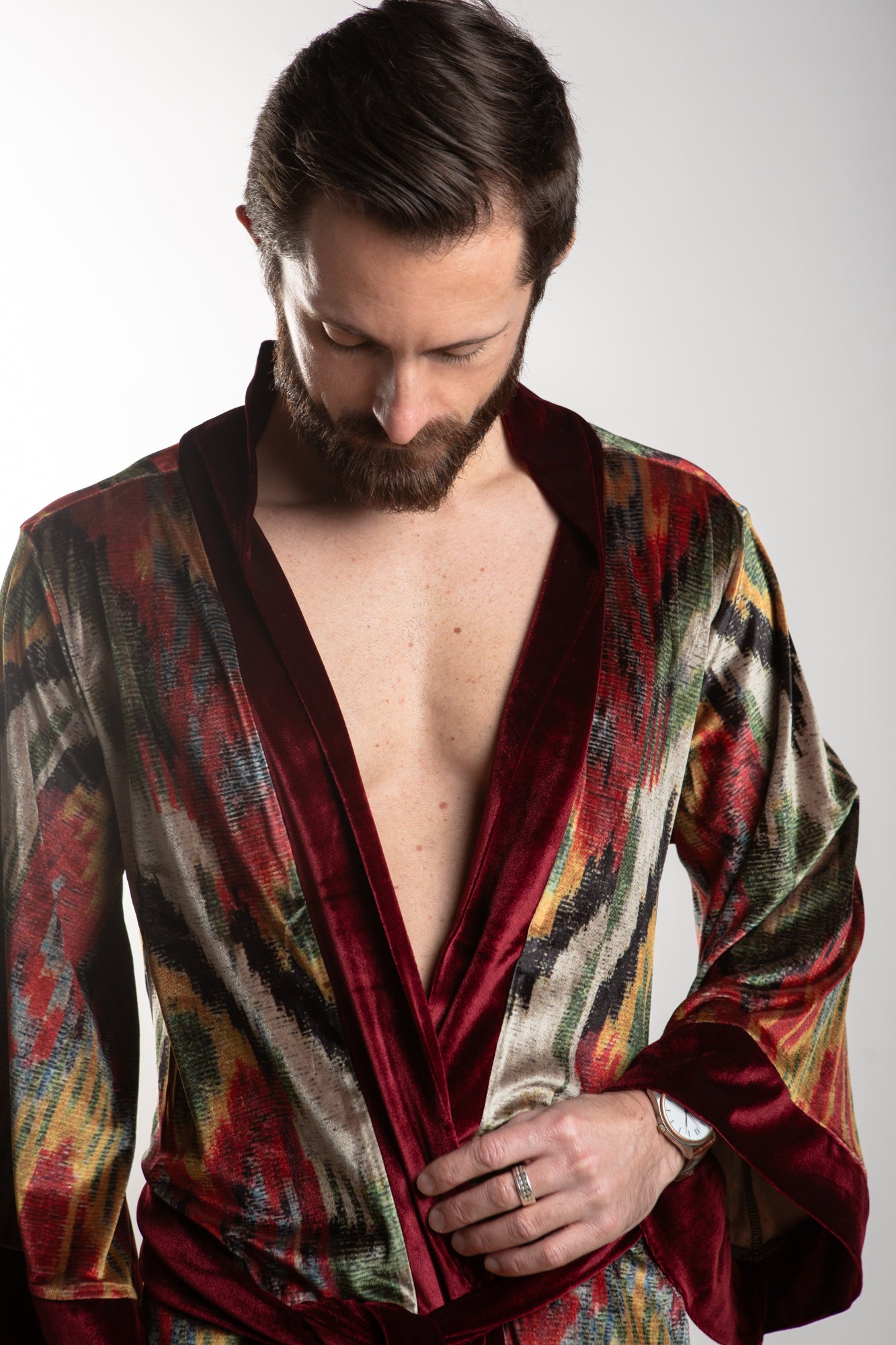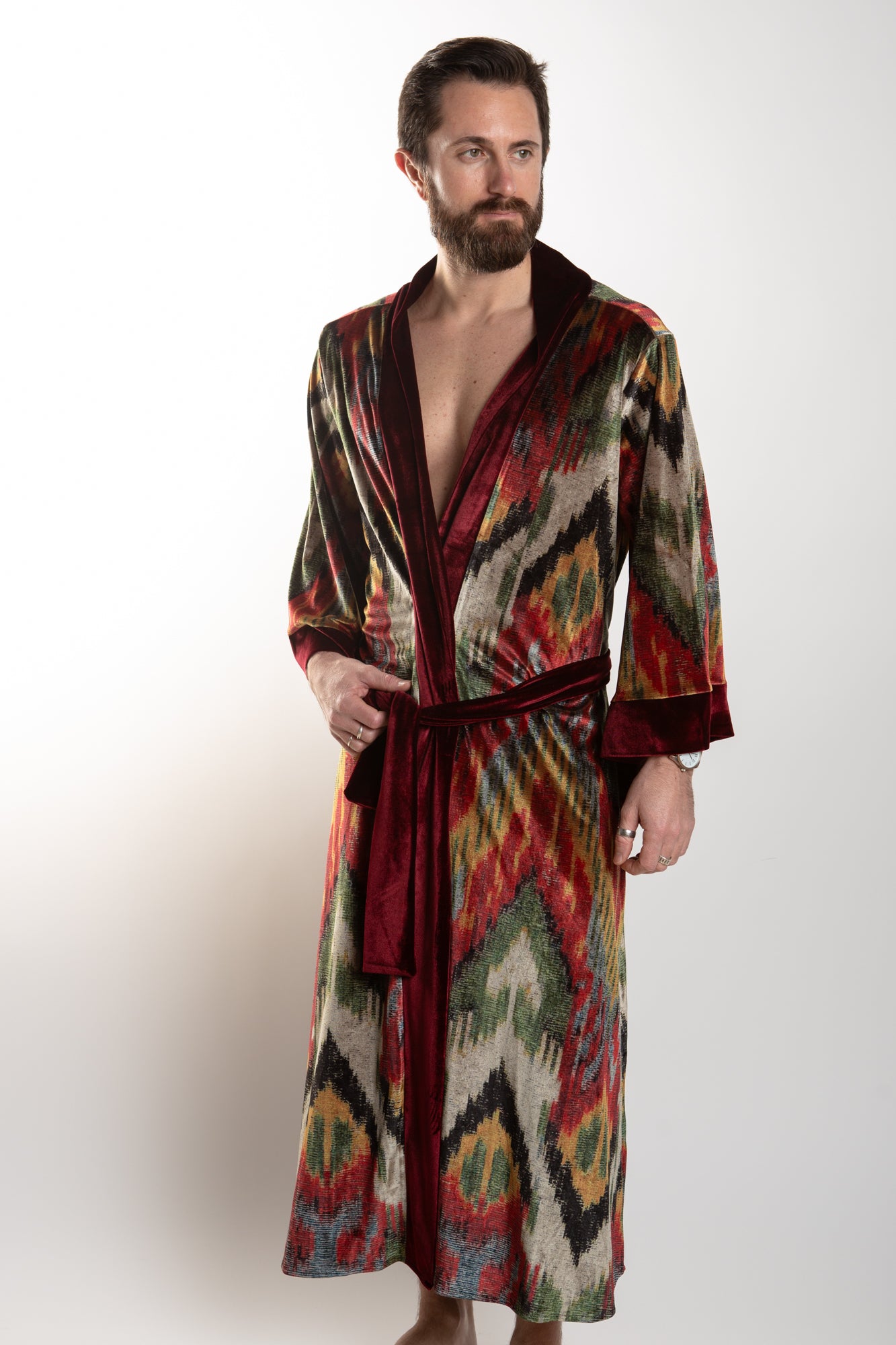 This elegant velvet robe features accent piping and gorgeous paisley prints in a royal color scheme, sure to add an air of sophistication to any look. The robe comes with a matching belt for a secure fit.