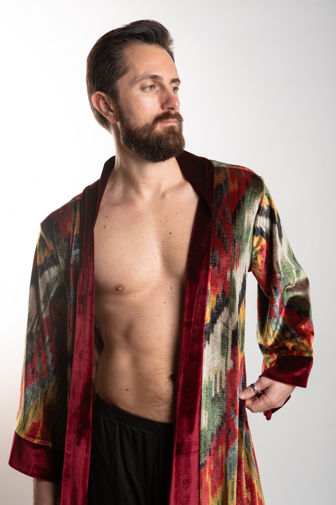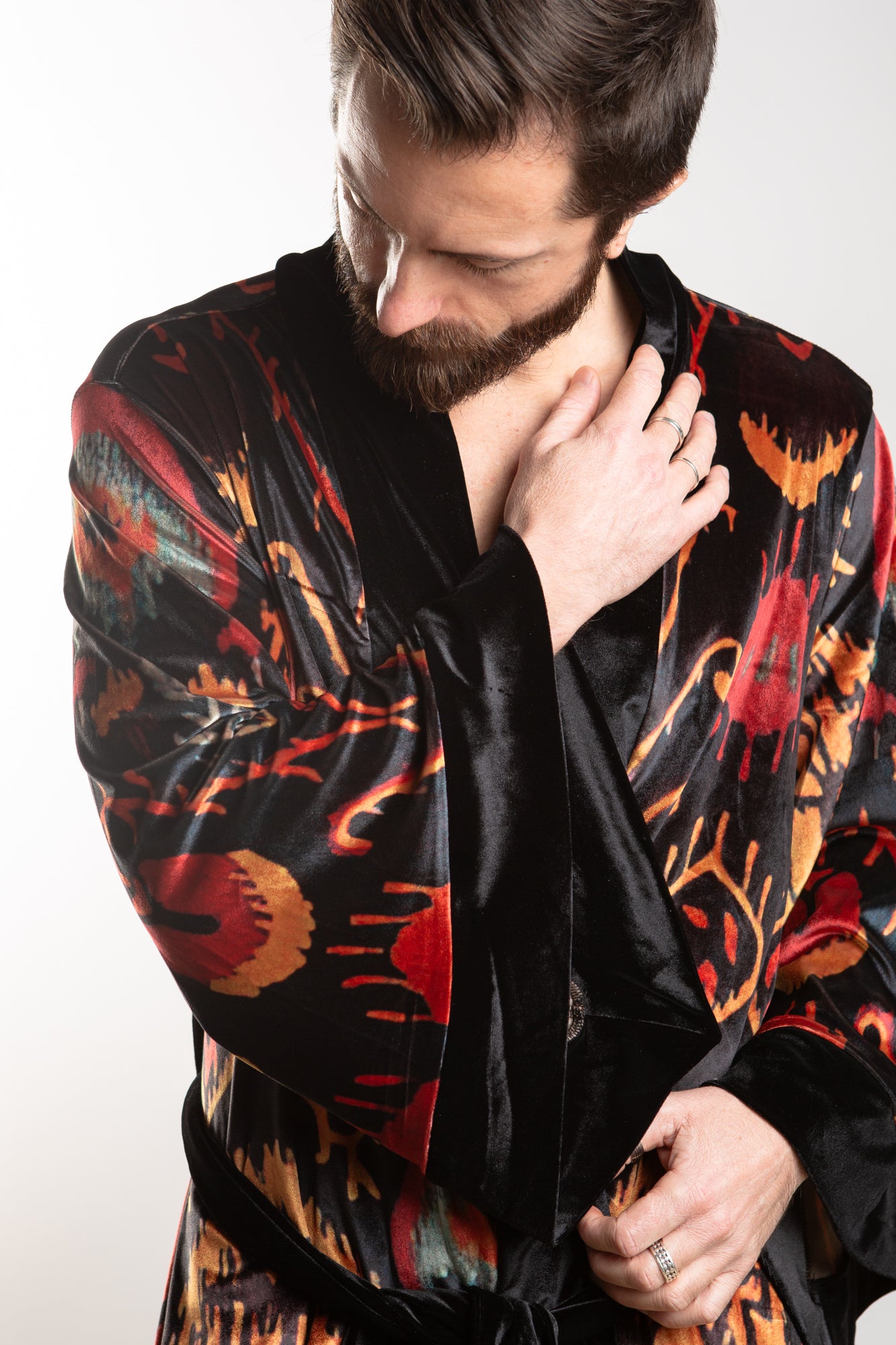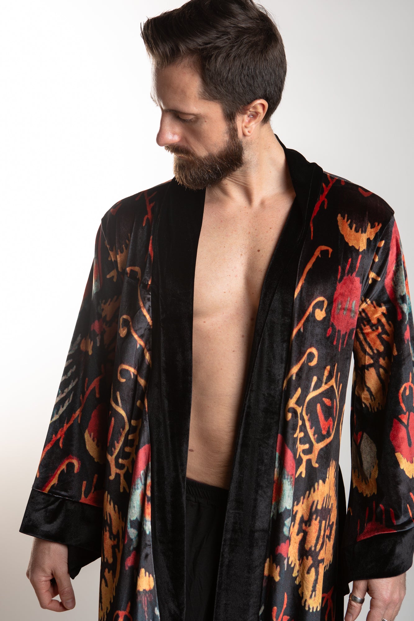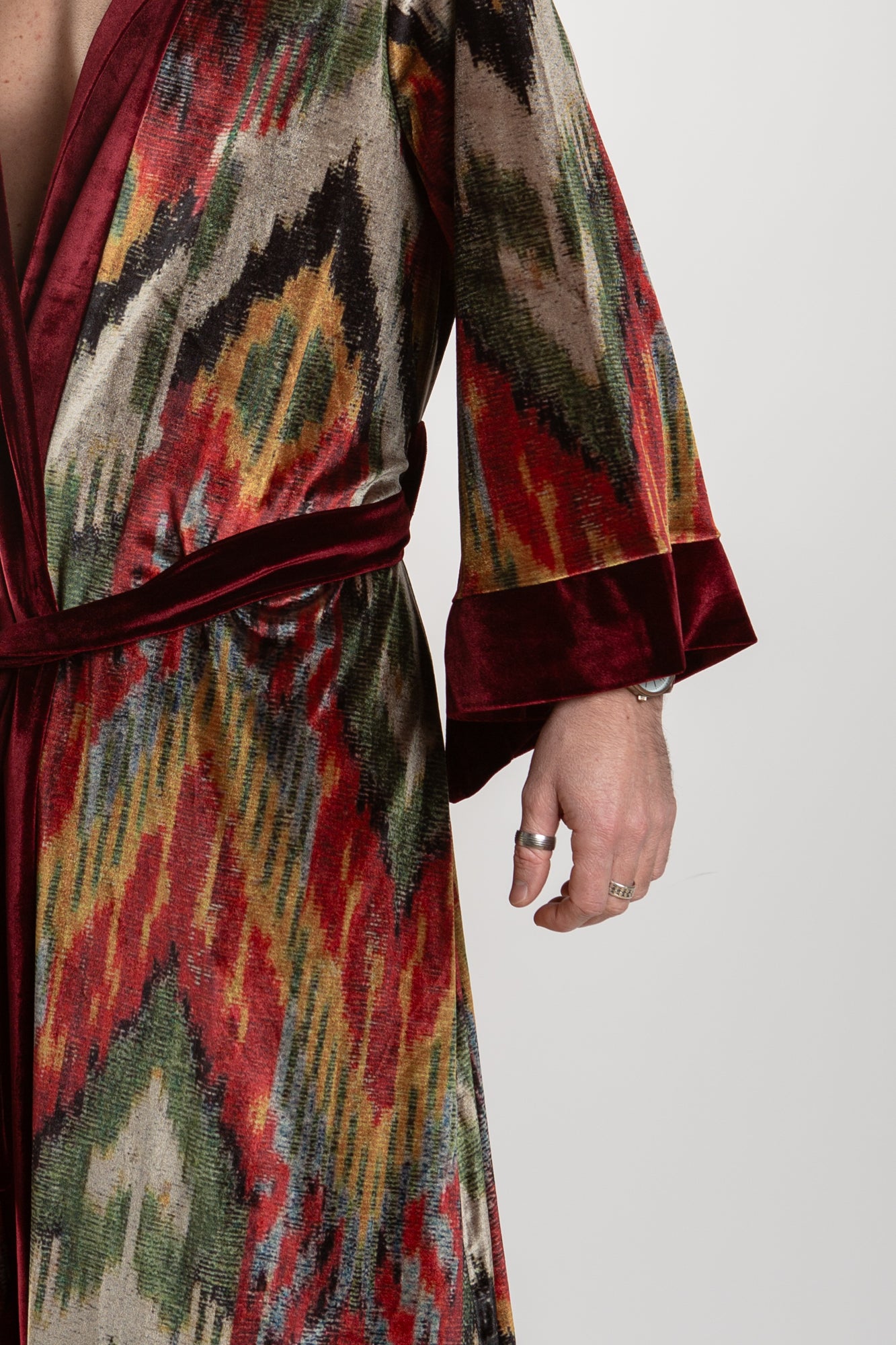 This elegant velvet robe features accent piping and gorgeous paisley prints in a royal color scheme, sure to add an air of sophistication to any look. The robe comes with a matching belt for a secure fit.