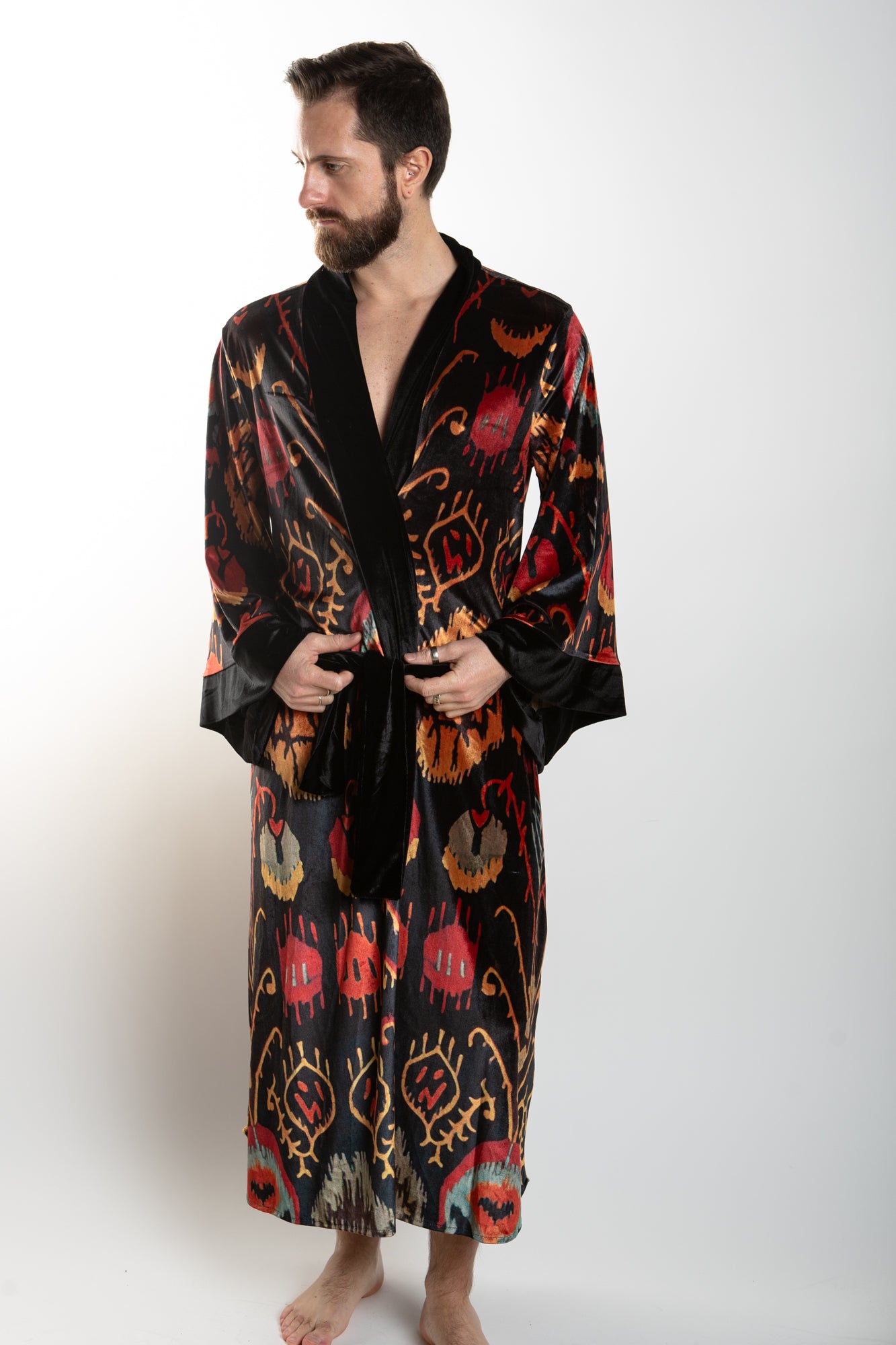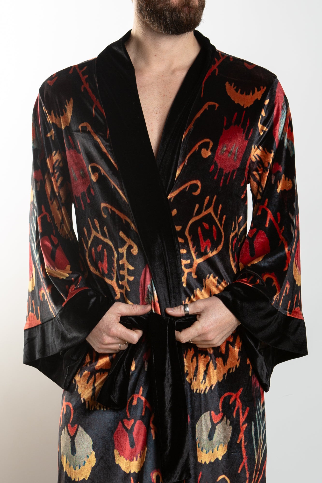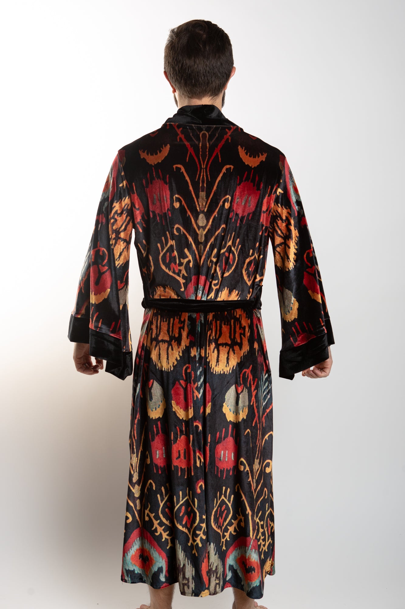 This elegant velvet robe features accent piping and gorgeous paisley prints in a royal color scheme, sure to add an air of sophistication to any look. The robe comes with a matching belt for a secure fit.