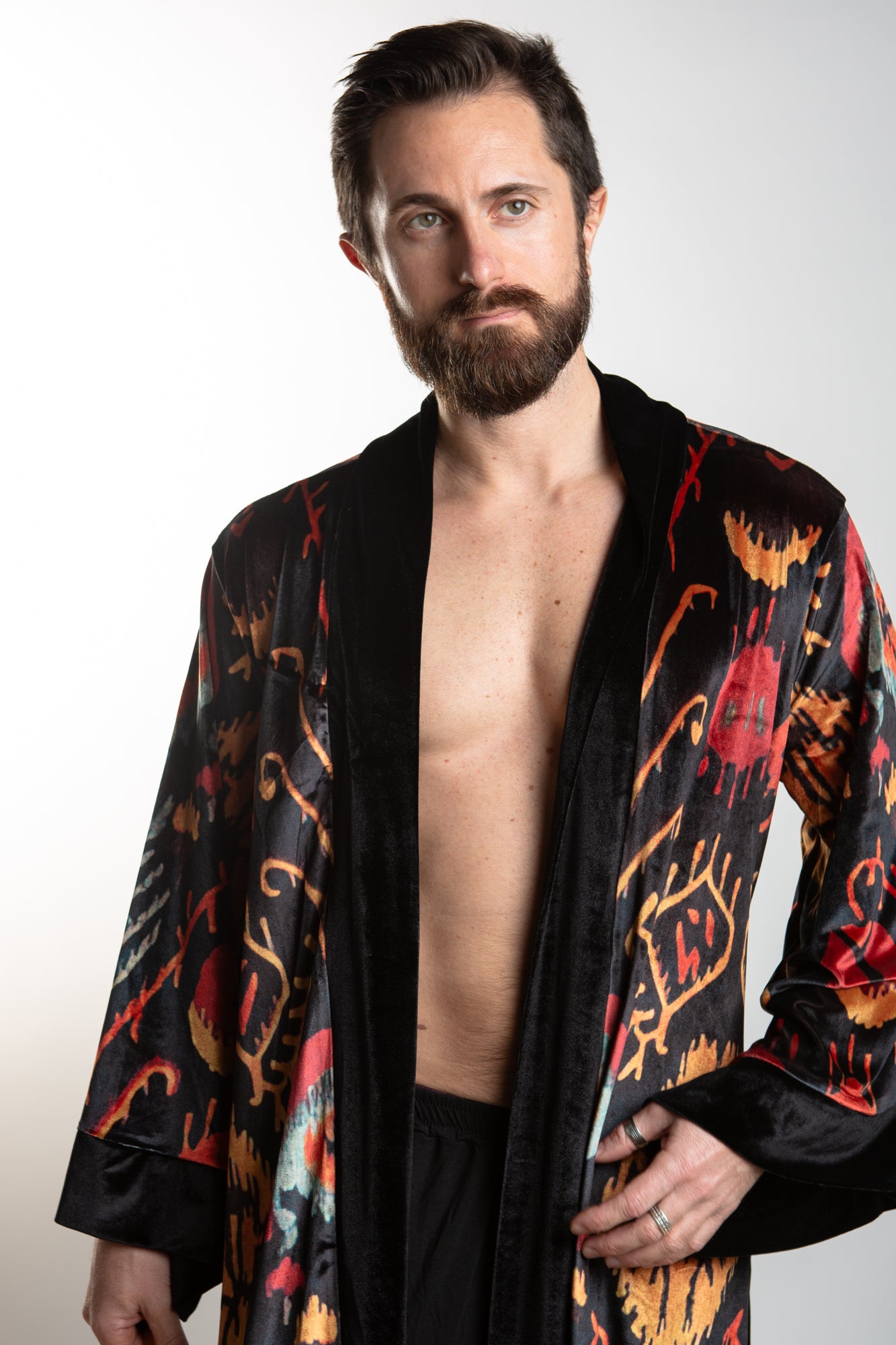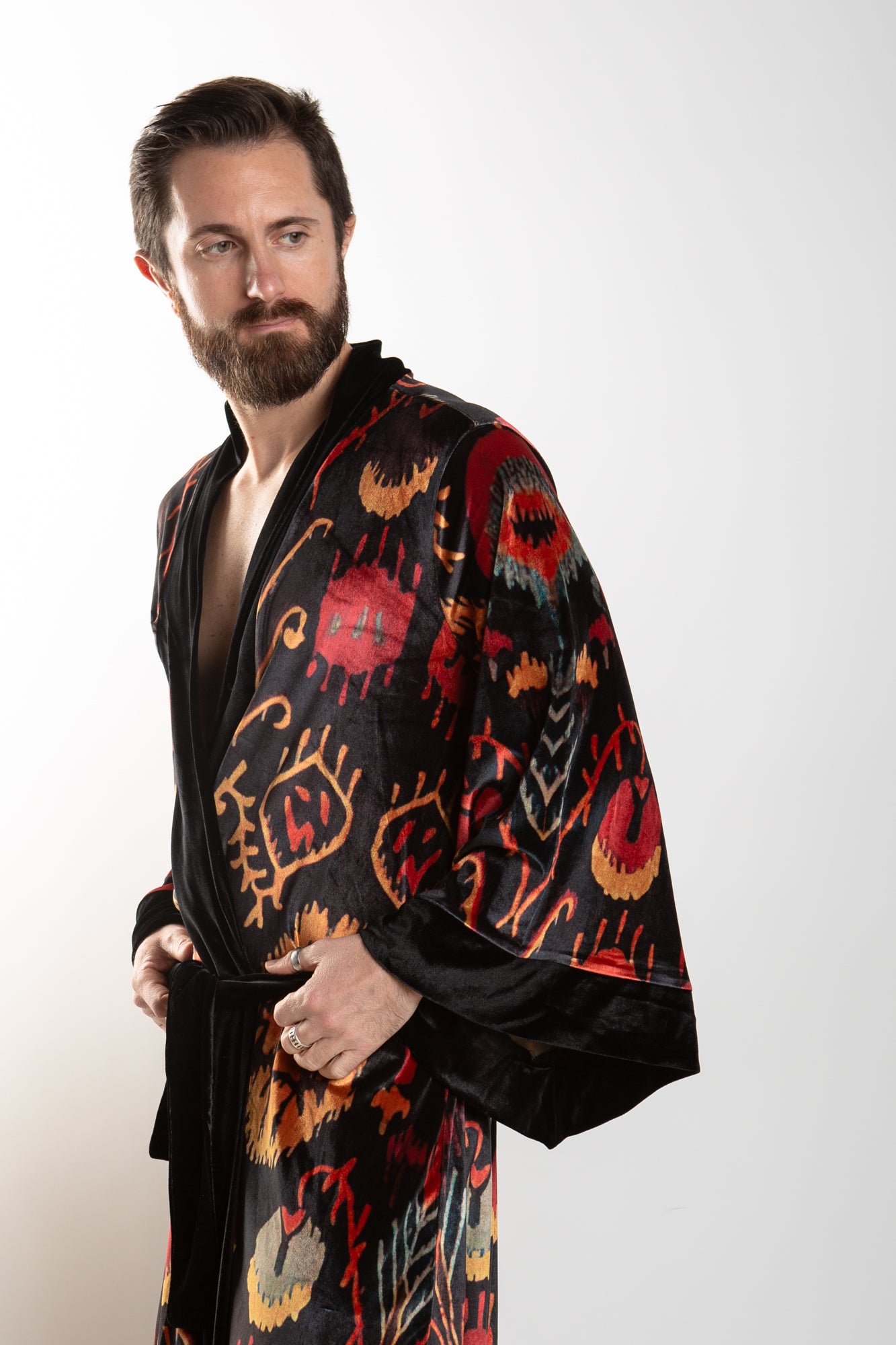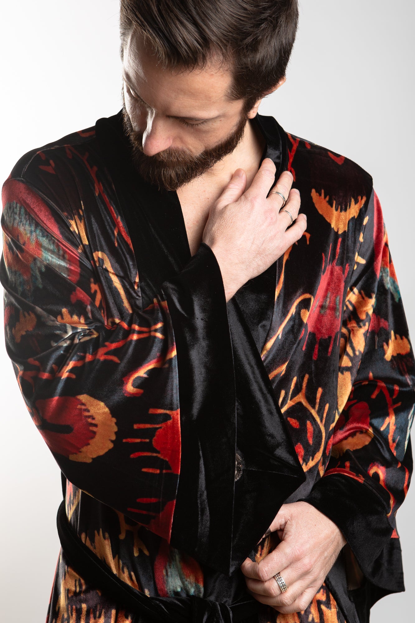 This elegant velvet robe features accent piping and gorgeous paisley prints in a royal color scheme, sure to add an air of sophistication to any look. The robe comes with a matching belt for a secure fit.