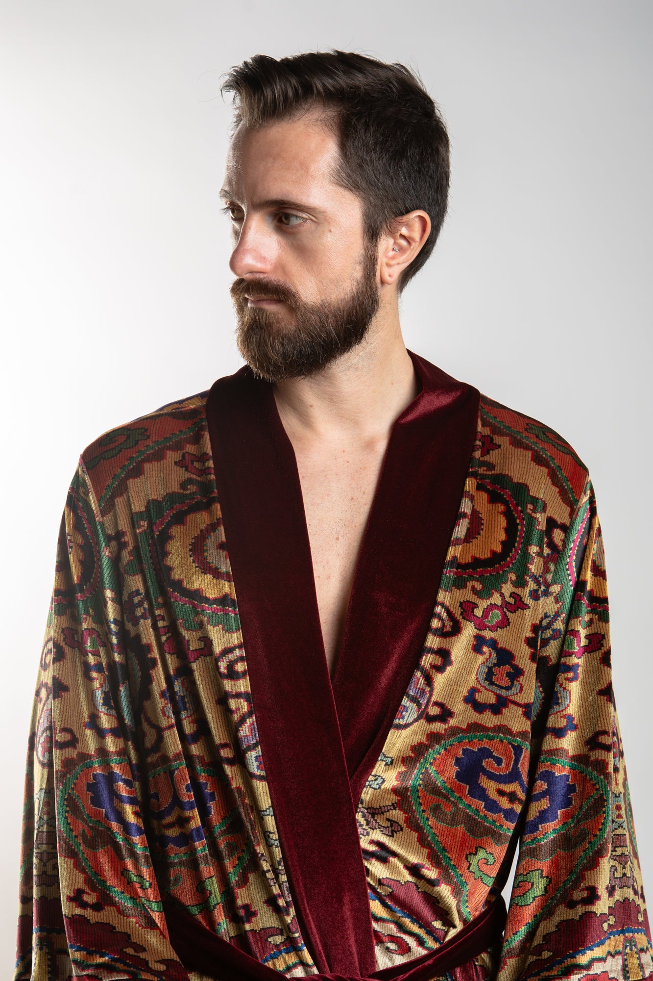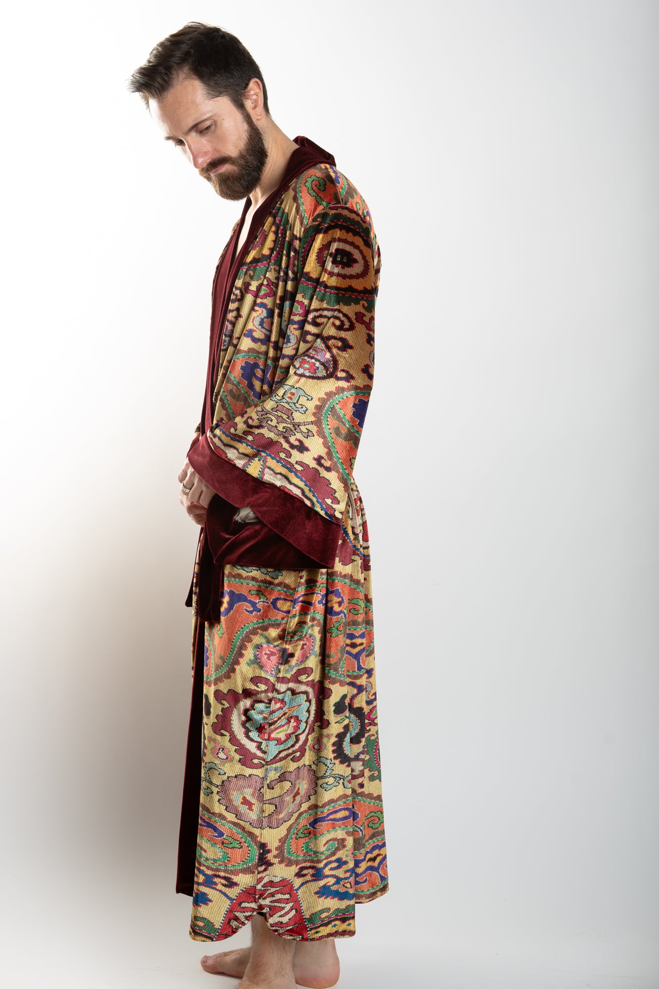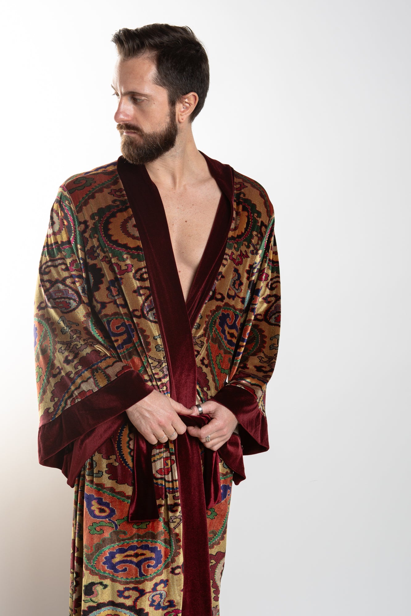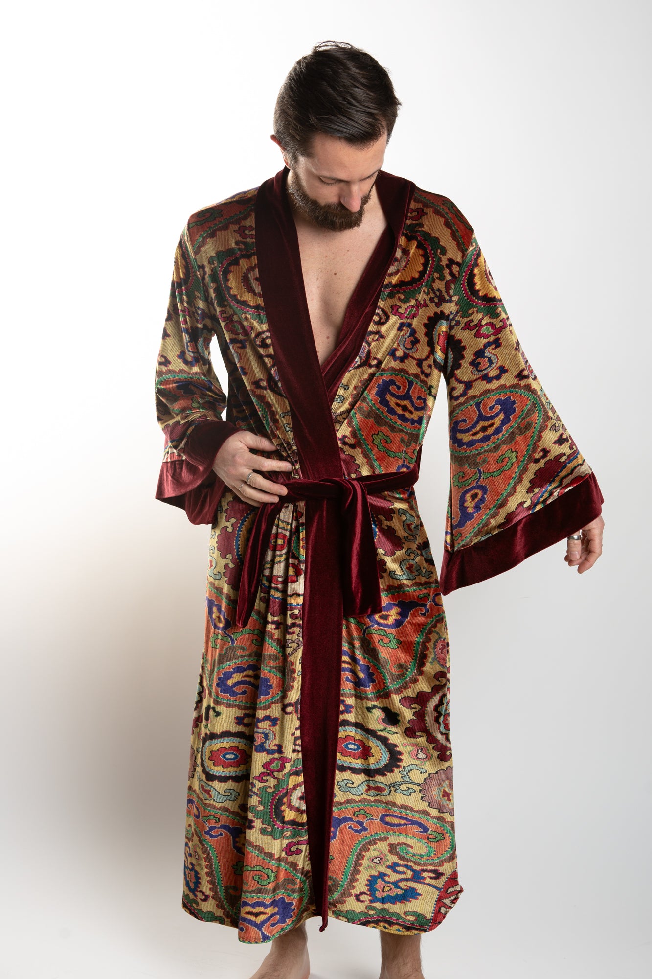 This elegant velvet robe features accent piping and gorgeous paisley prints in a royal color scheme, sure to add an air of sophistication to any look. The robe comes with a matching belt for a secure fit.