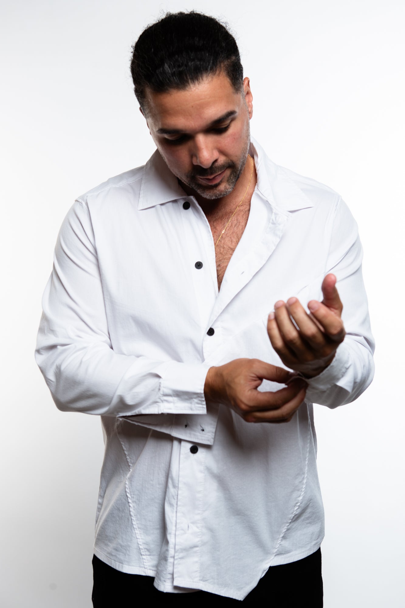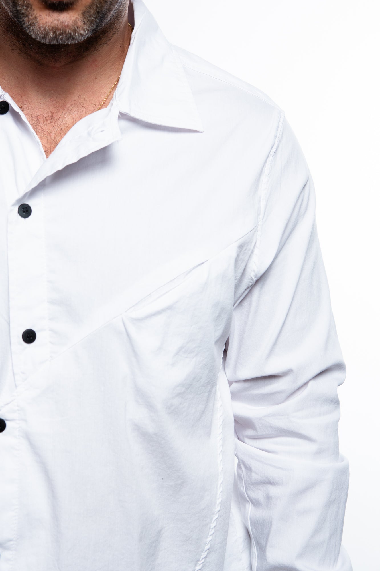 Elevate your style with our XPent Long Sleeve Shirt - Asimmetrico. Crafted from a lightweight fabric, this white collared shirt boasts striking black buttons and an asymmetrical silhouette.